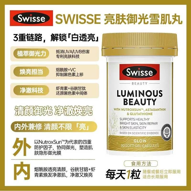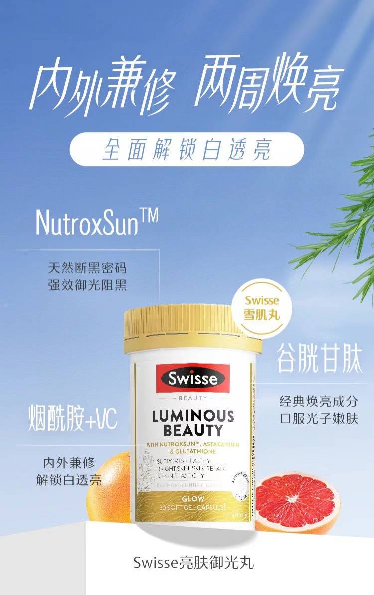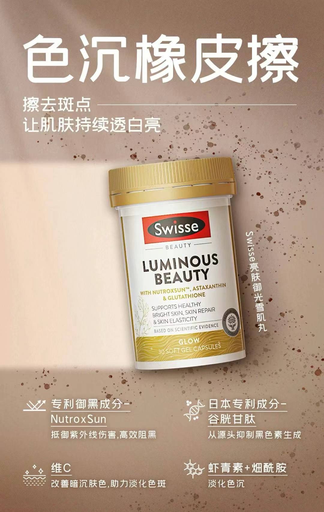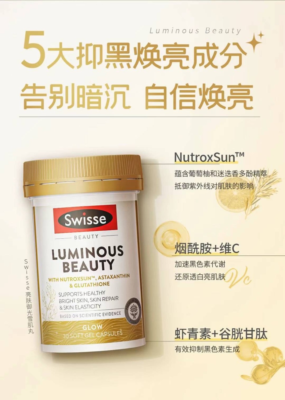 Swisse亮膚御光雪肌丸,天然呵護,逆轉歲月痕跡!含NutroxSun™高效防禦日曬,結合VC和蝦青素,給肌膚全方位的抗氧化保護。不僅讓肌膚煥發光彩,還助您打造健康緊致的肌膚質感。每一粒,都是為美麗加分的精心之選!