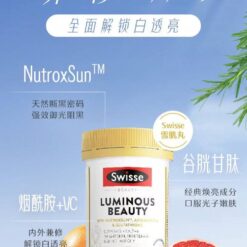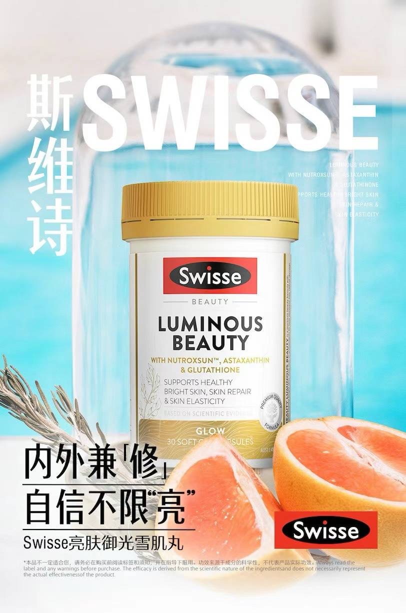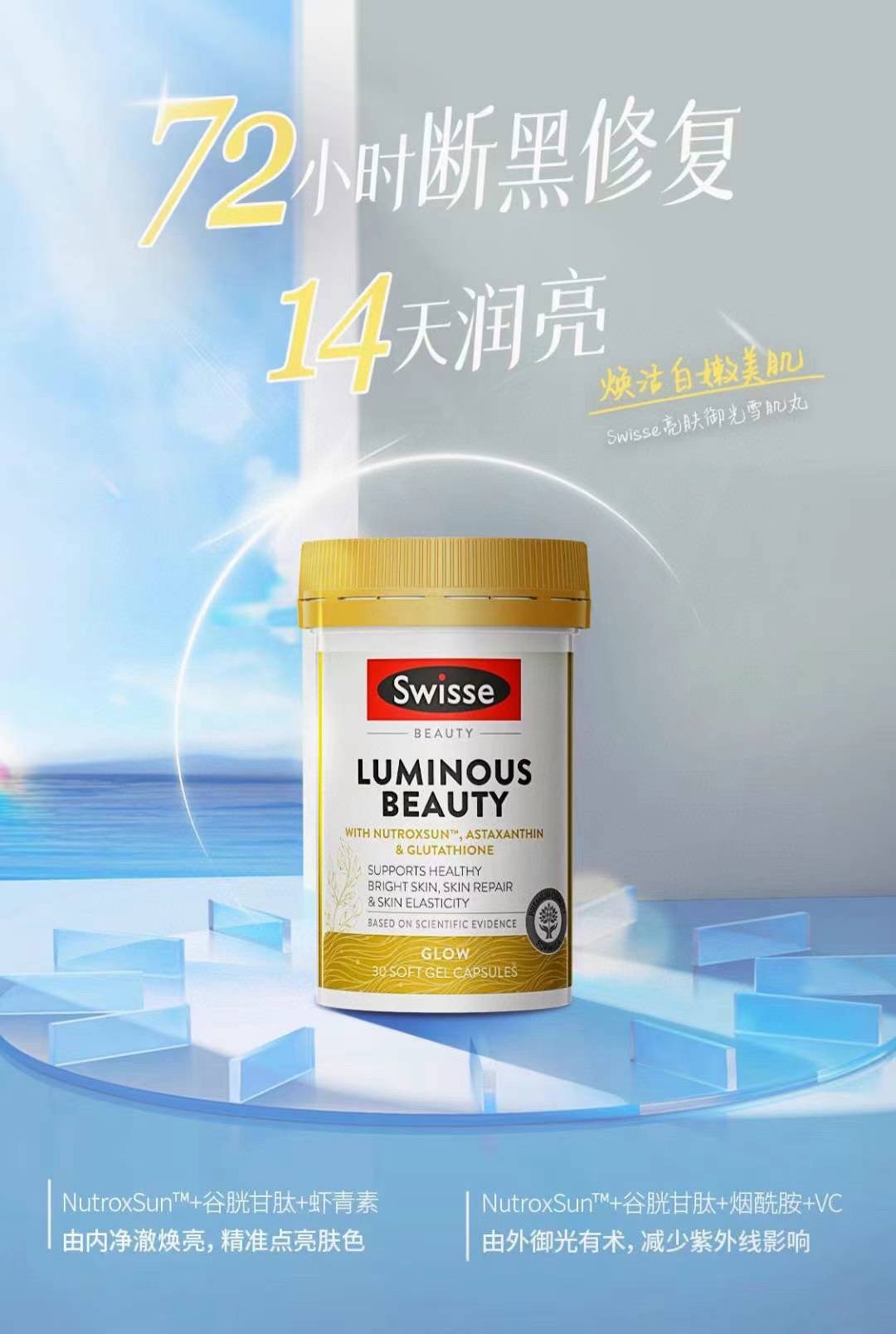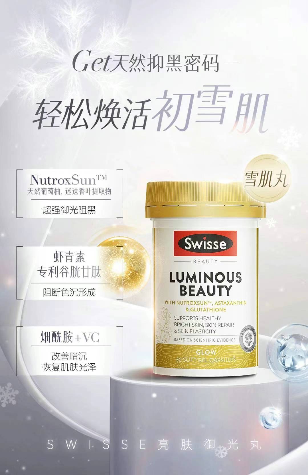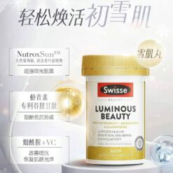 Swisse亮膚御光雪肌丸,天然呵護,逆轉歲月痕跡!含NutroxSun™高效防禦日曬,結合VC和蝦青素,給肌膚全方位的抗氧化保護。不僅讓肌膚煥發光彩,還助您打造健康緊致的肌膚質感。每一粒,都是為美麗加分的精心之選!