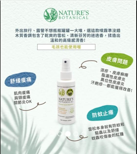 來自澳洲的Natures Botanical已經有20年的歷史了,每年都熱賣百萬瓶,是在澳洲非常熱門的防蚊舒緩護膚品,成分很簡單:【雪松、迷迭香】,這是蚊蟲很討厭的氣味,所以可以驅蟲防蚊,而且雪松還能舒緩被蚊蟲叮咬的紅腫搔癢,家家戶戶必備,雪松是木質調的精油,檜木香氣聞起來很舒服,很像置身在森林裡一樣,也有消除疲勞、放鬆身心的效果!有添加雪松的護膚品都很好聞,不會有化學刺激味,給小朋友用也OK~