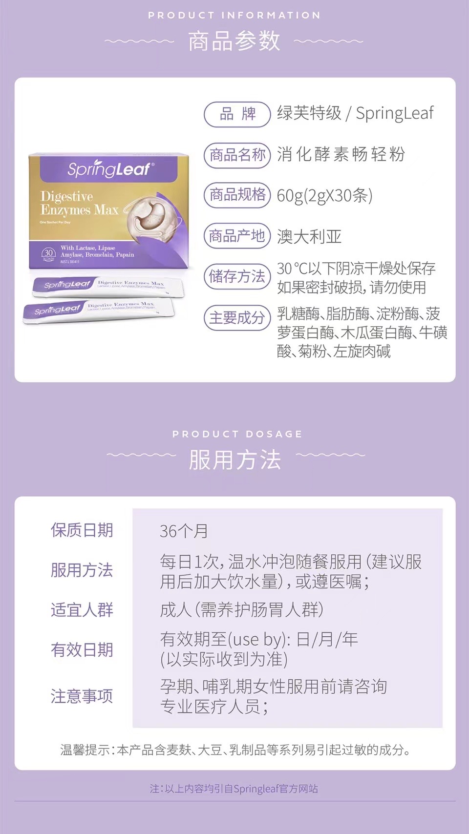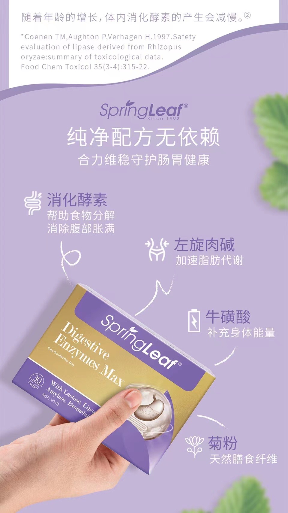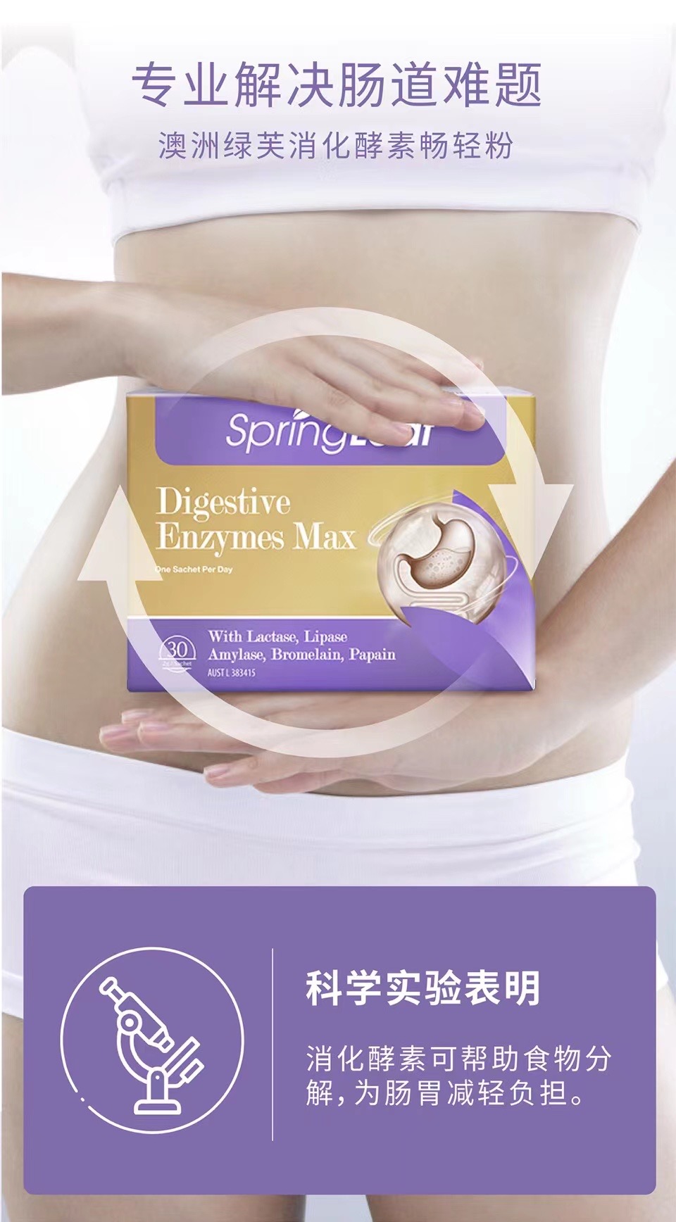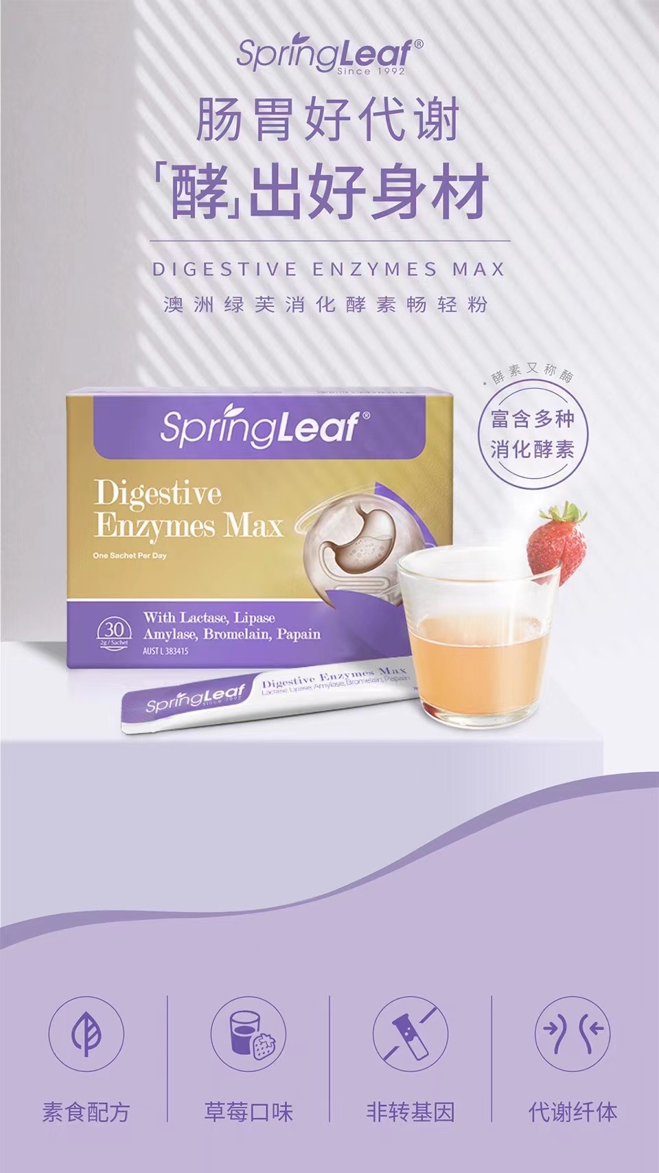 胃脹胃虛,消化不良。腸道不適,宿便不順。您需要一支澳洲綠芙消化酵素暢輕粉。專業解決腸道難題,科學配方,富含多種消化酵素。隨餐一杯、輕鬆加倍, 養出好腸胃!素食配方、草莓口味,添加左旋肉鹼、牛磺酸和菊粉,加速脂肪代謝、補充身體能量!每日一杯喝出健康,冷熱即溶 代謝輕暢。SpringLeaf綠芙特級,全球認證的生產標準,健康保證,加倍安心!