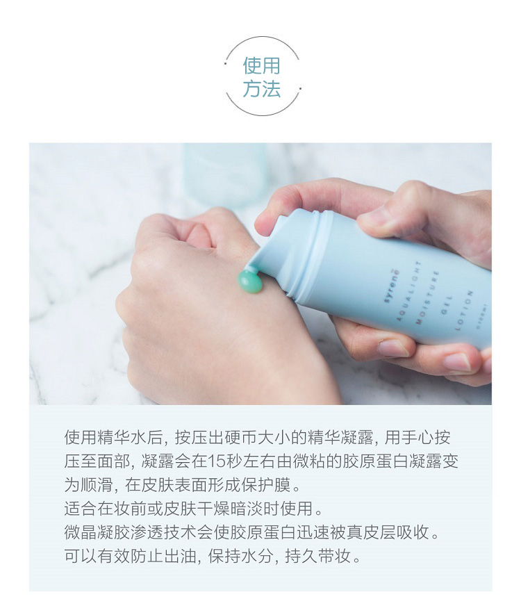 清爽但濃厚的凝膠乳液,有效對抗日曬,長效保濕。