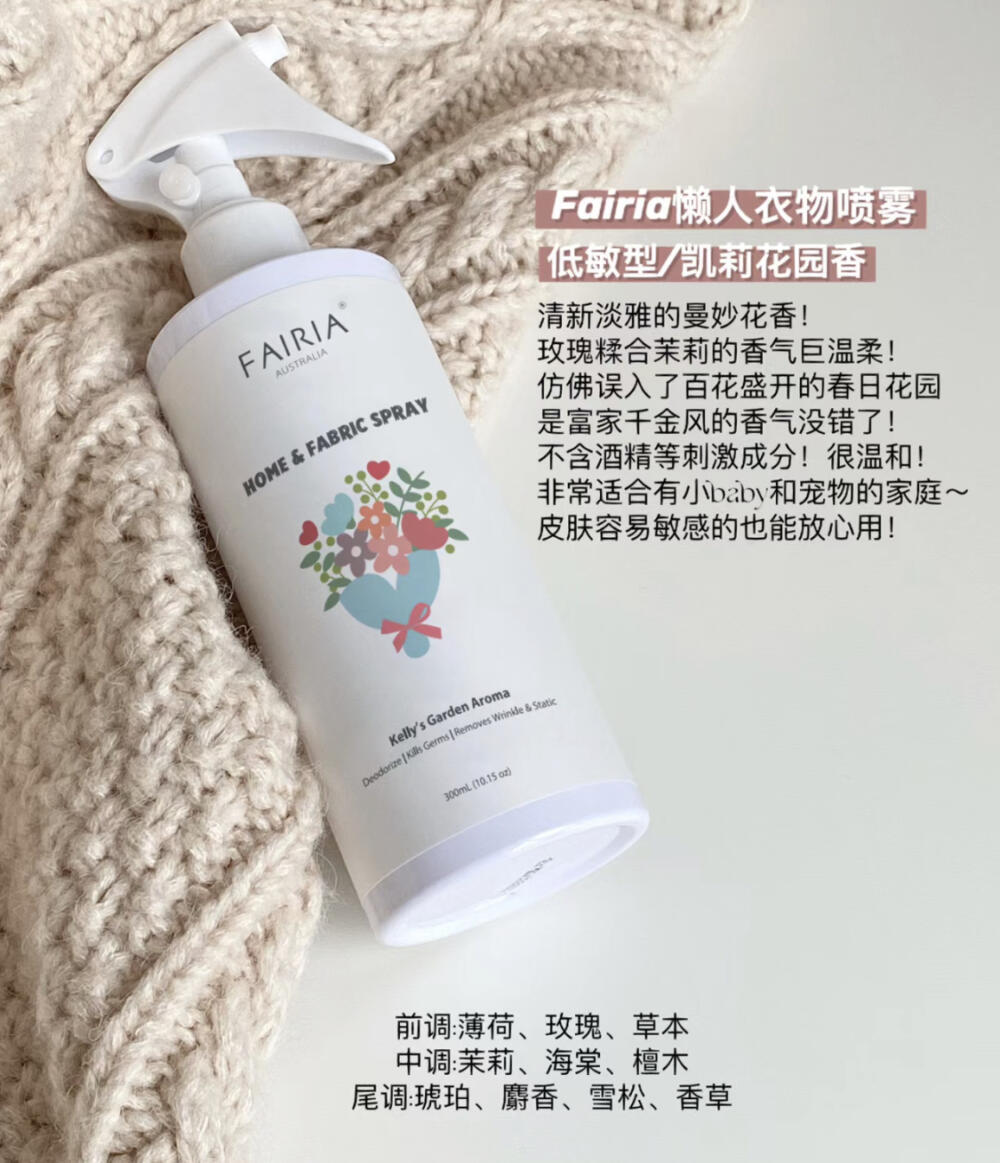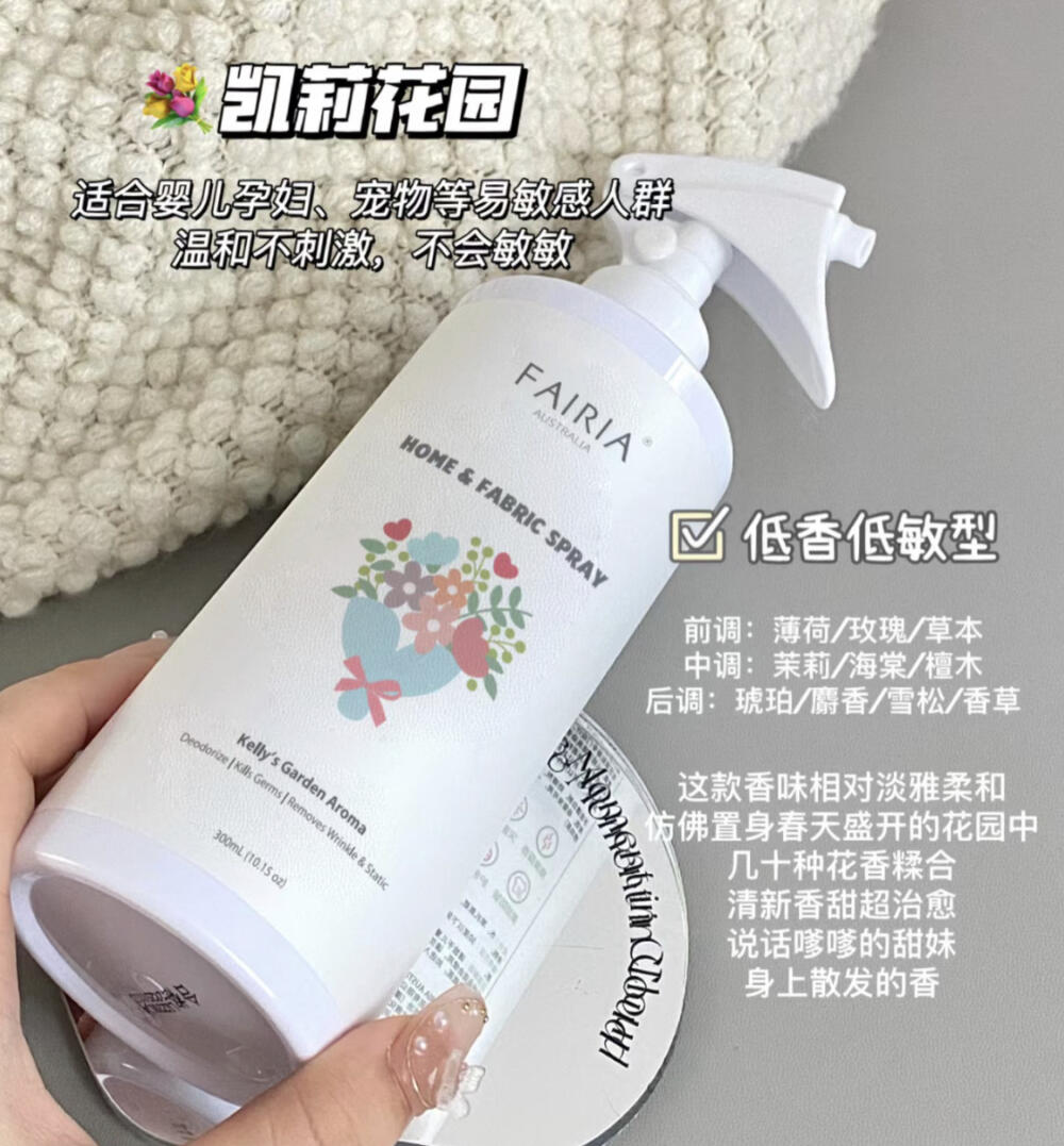香調整體是質感的花香。玫瑰與茉莉展現了溫柔的氣息,香草混合木質香帶來微甜的溫暖質感。香氣保持著淡雅的平衡,淡淡的很溫柔,給人治癒的感覺。凱莉花園是低敏款,孕嬰寵都可以用,無毒無剌激,敏感人群就選這款🥰