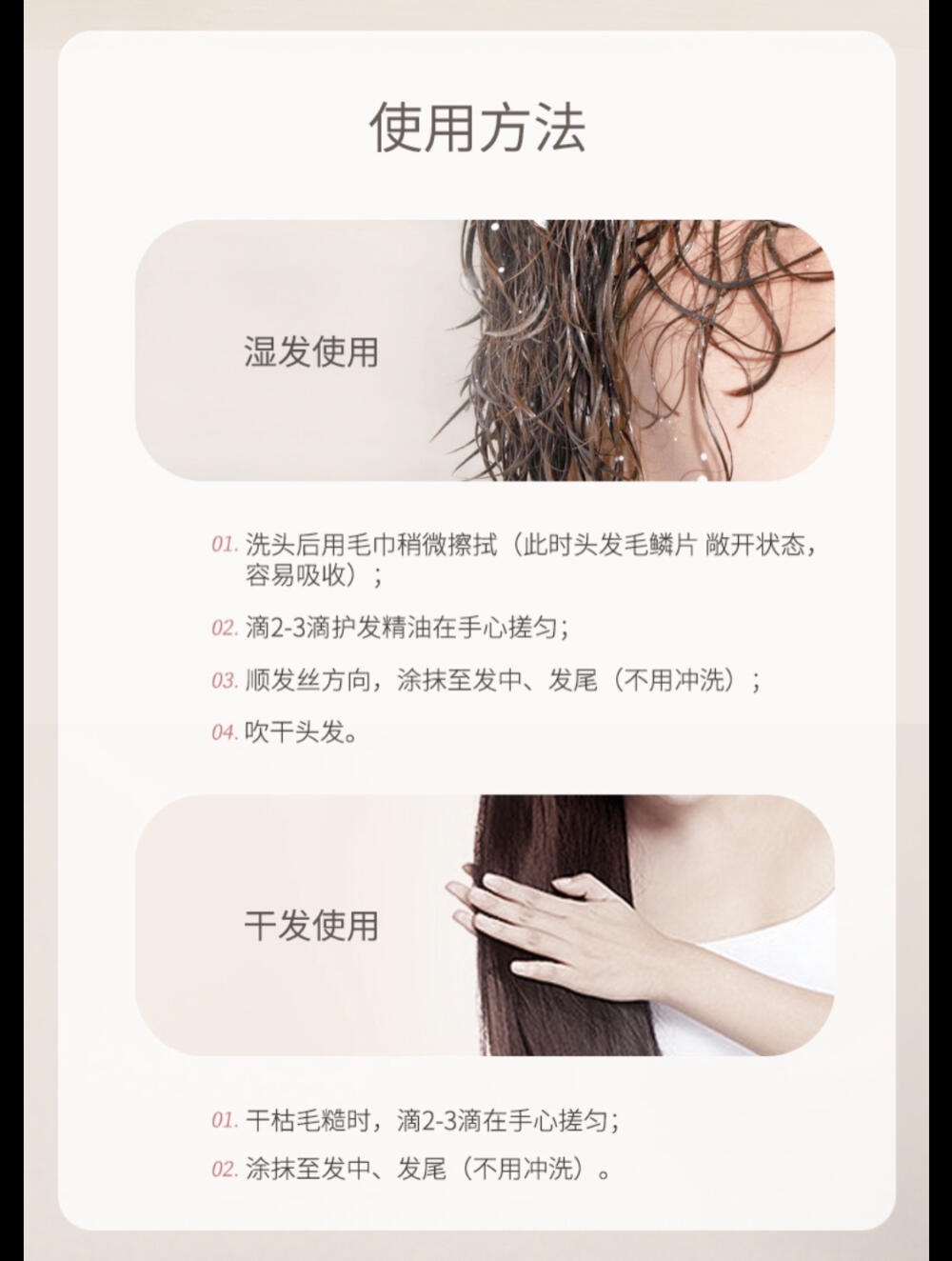滴款設計取量方便,頭髮半乾的時候塗,吹乾後柔順光澤帶香氣,不油膩~ 高級貴氣感迎面而來,精緻女生必備,好感度瞬間上升,強力推薦此款精油護髮油😍
