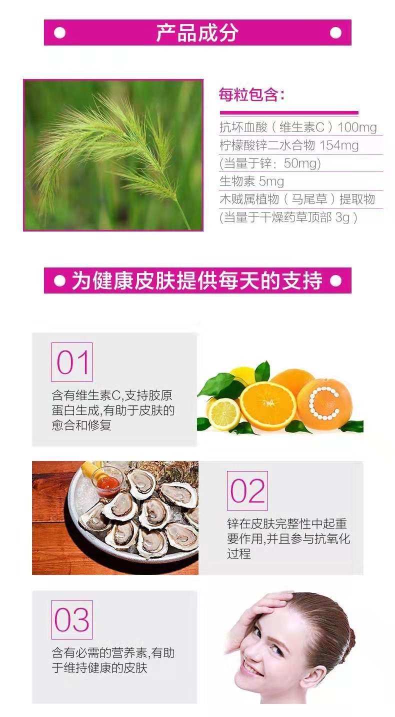 能夠修復受傷的膠原和彈性纖維,補充組織流失的膠原蛋白。防止皮膚皺紋,使皮膚維持光滑有彈性。滋養皮膚、毛髮、指甲。有效消除各種皮膚斑點,去除黑斑、老人斑,抗老化、防皺紋、美容養顏。促進皮膚細胞再生、回復肌膚彈性。使皮膚水潤亮澤,散發健康光彩。