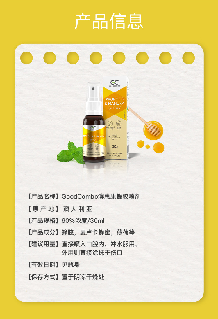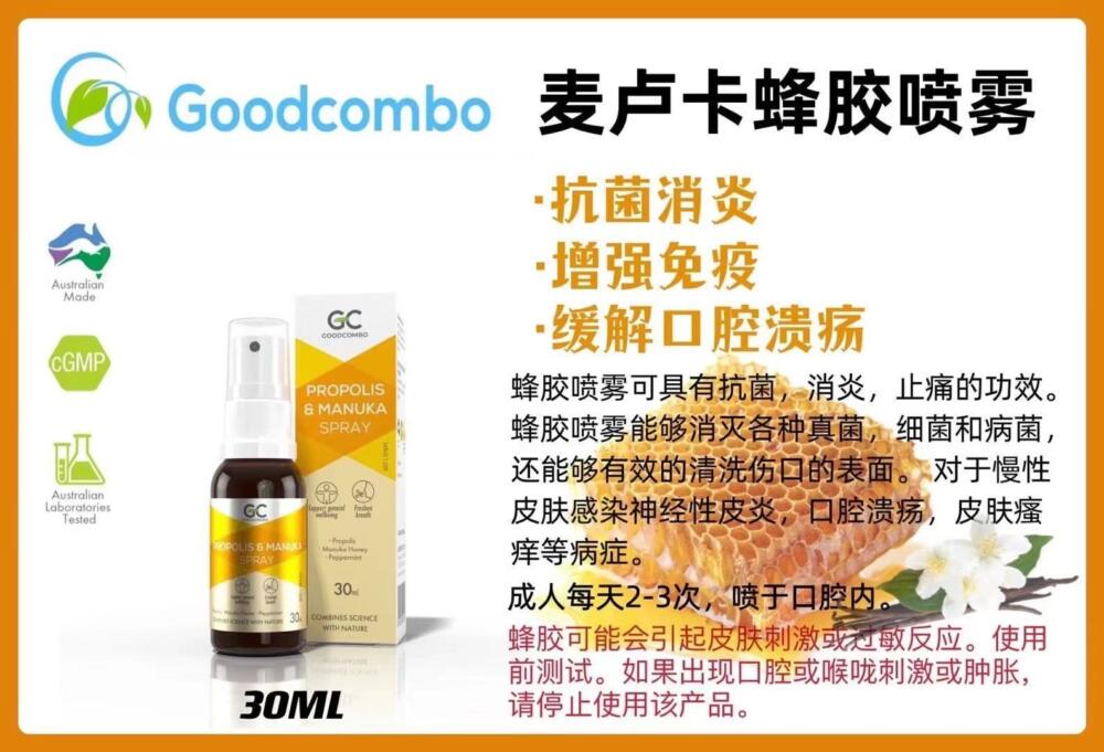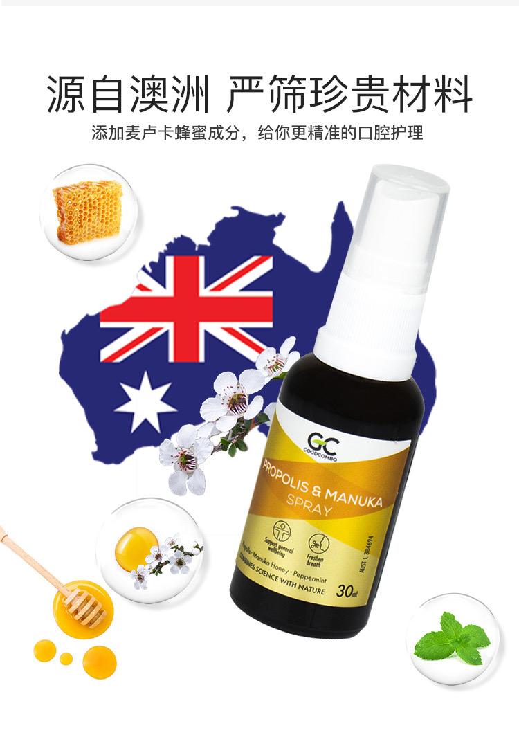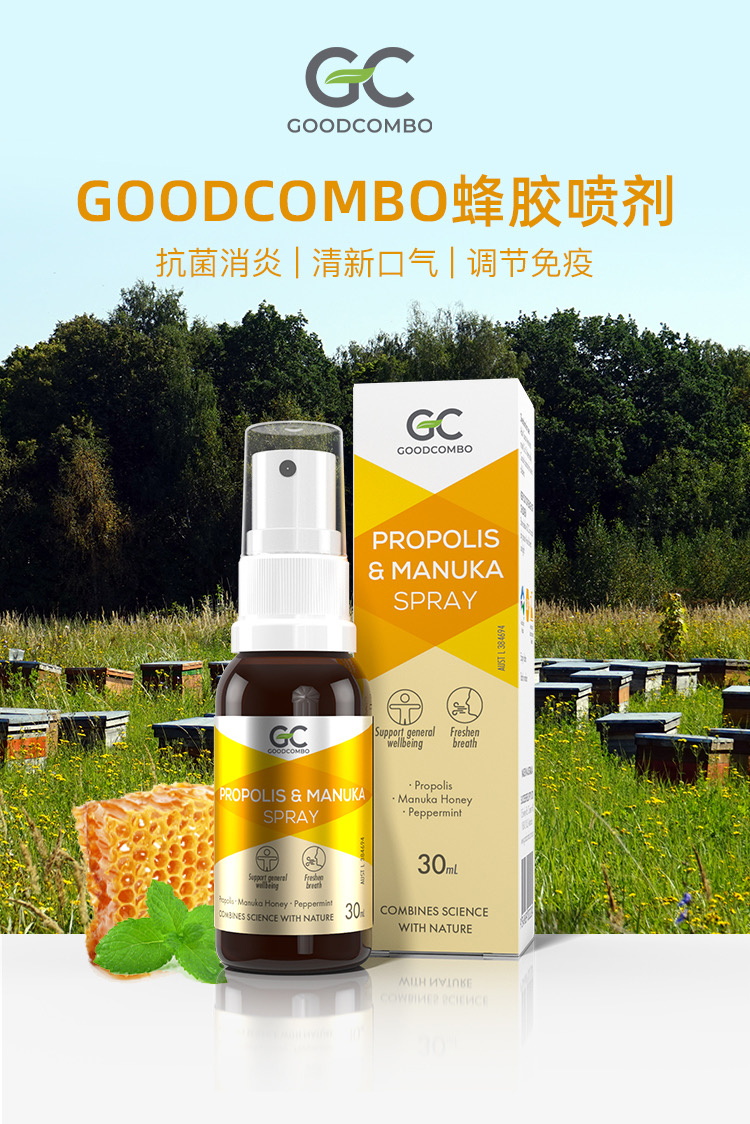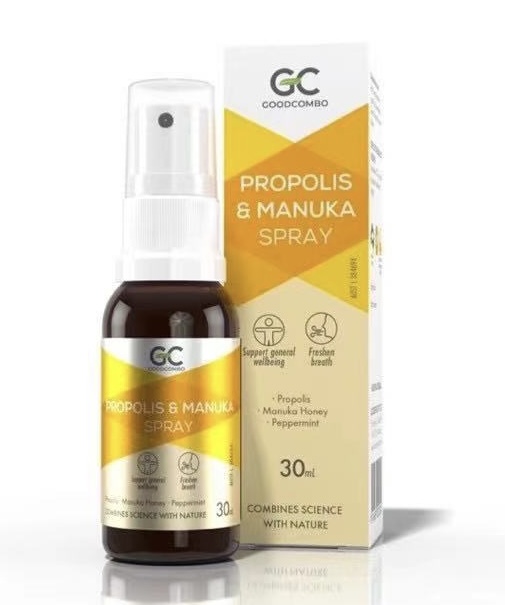 Goodcombo蜂膠噴霧30ml含有蜂膠、麥盧卡蜂蜜、薄荷三大純天然成分。可以提高身體免疫力👉清新口氣👉有效應對口腔潰瘍👉咽喉腫痛👉緩解流感症狀👉適宜各類人群👍