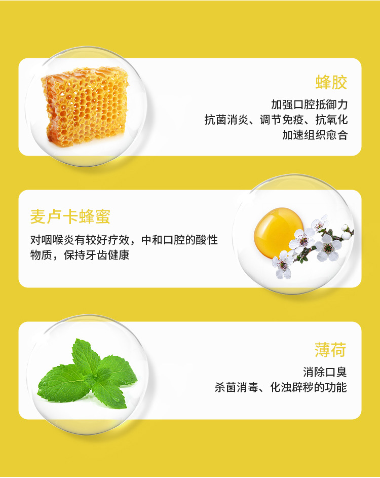 蜂膠和麥盧卡蜂蜜是絕佳的天然組合。可提高傷口,切口和擦傷的愈合速度,抗菌功效可暫時緩解感冒、喉嚨痛、口腔潰瘍和其他口腔感染的症狀。
