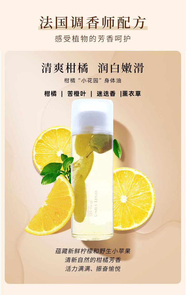 由玫瑰果油、酪梨油、甜杏仁油和杏桃仁油混合,富含維生素E,深層滋潤、鎖水保濕,並緩解肌膚乾燥。這款美麗的身體油中含有真正的檸檬和野生蘋果。可在沐浴後代替身體乳使用,尤其適合身體乾燥部位;也可作為按摩油或沐浴油使用。產品不含合成色素、香精和防腐劑