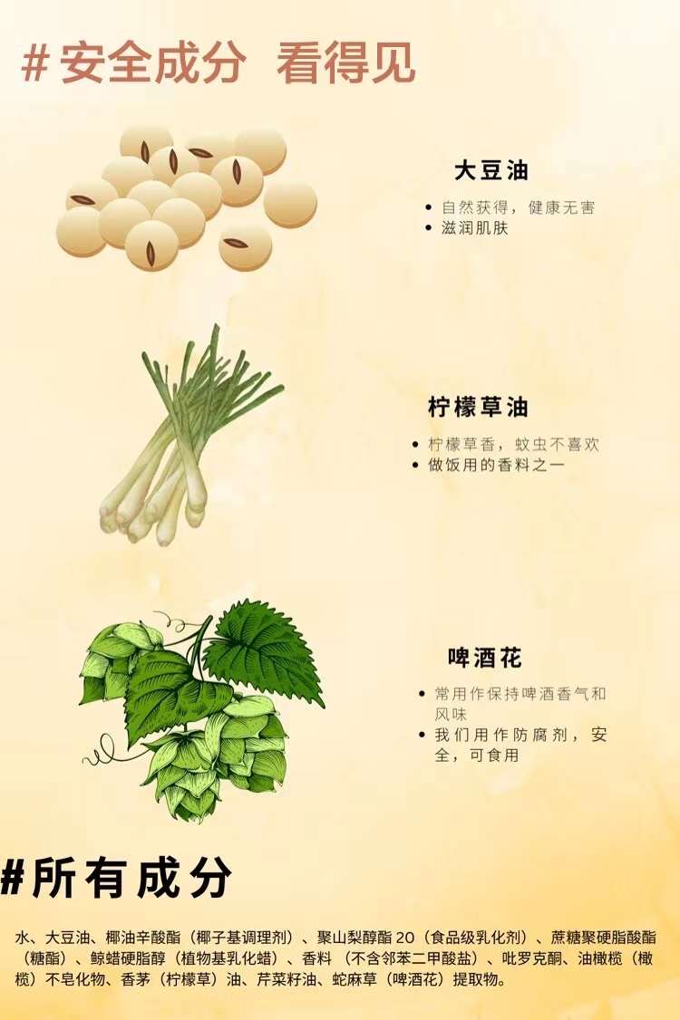🍃富含澳洲檸檬香草,芹菜籽,啤酒花精華。🌱驅蚊不殺蚊,隨時防護。💖天然有效,媽媽安心使用。🌷植物驅蚊,大容量。🔹持續8小時防護,跟蚊子說拜拜。🙌適合嬰兒和新生兒的嬌嫩肌膚。
