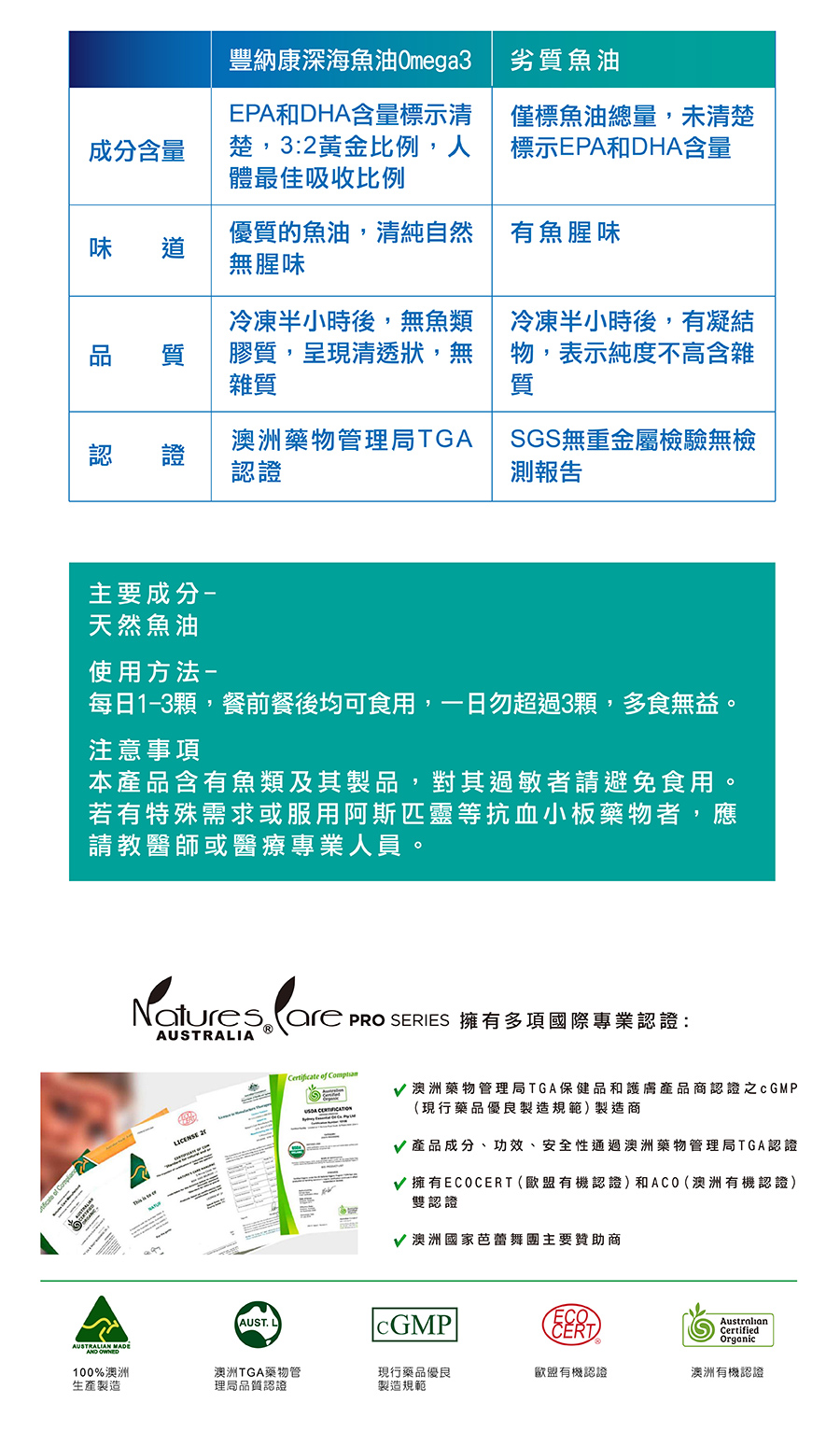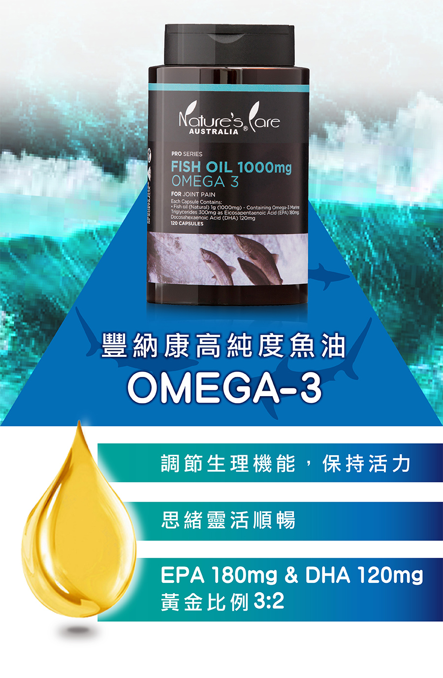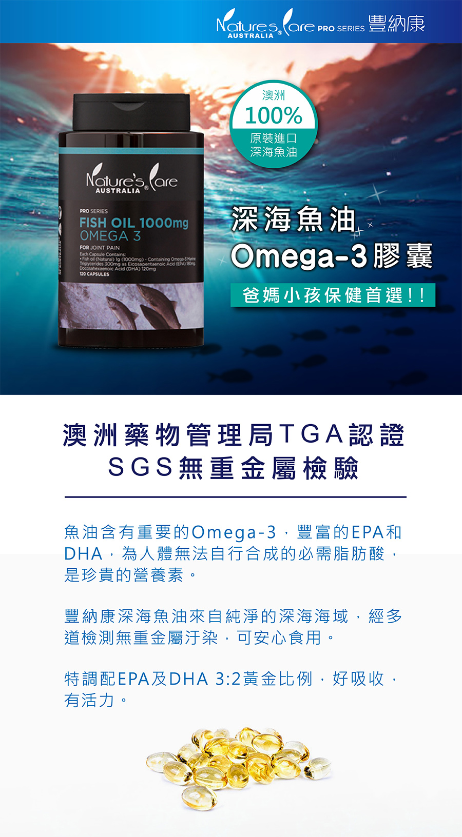 深海魚油含有重要的Omega-3,豐富的EPA和DHA,為人體無法自行合成的必需脂肪酸,是珍貴的營養素。Nature’s Care深海魚油來自純淨的深海海域,經多道檢測無重金屬汙染。