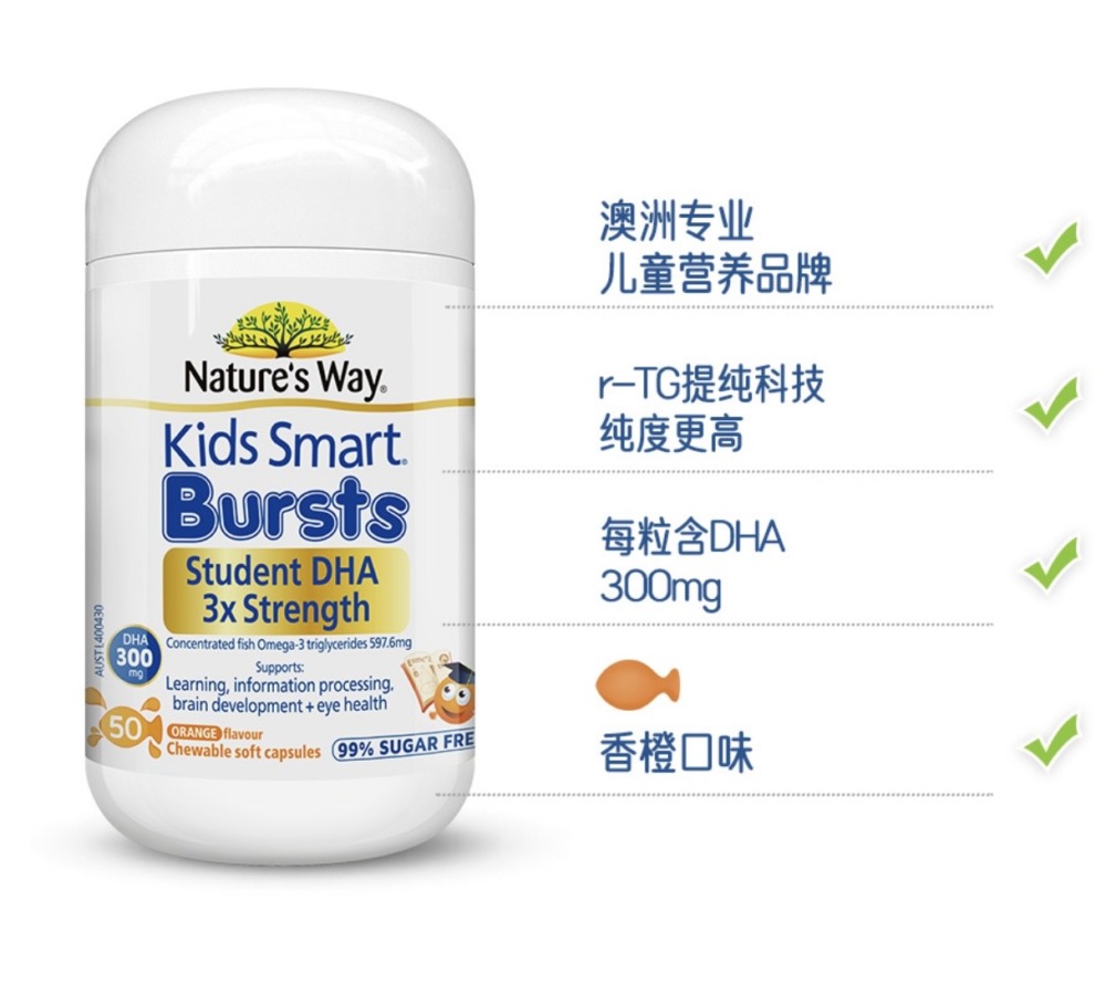 本品是橘子味的可咀嚼的膠囊,裡面富含歐米加 -3 DHA。它提供了兩種主要的歐米加 – 3脂肪酸兒童智能DHA 300mg,是科學制定專為支持兒童的發展。 DHA是一種重要的營養物質,可以幫助支持認知健康和發育,維持健康的神經系統,支持視力和眼睛的發育。 DHA還可以幫助孩子的思考、學習和記憶的能力。另外,人們需要從食物或質量補充劑中獲取自身缺乏的營養,以滿足我們的日常需求。初步研究發現,本品不僅含有可以幫助兒童大腦發育的DHA,歐米加 -3 DHA還可以促進大腦思考,讓孩子熱愛學習和培養良好的行為習慣。