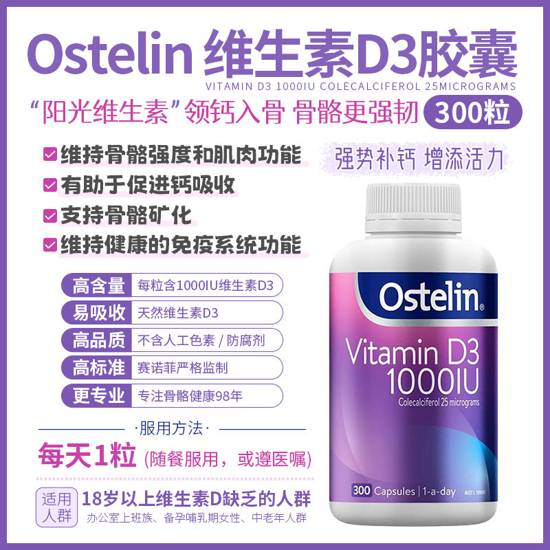 建議維生素D水平較低的人服用。 每個膠囊含有1000 IU的維生素D,這是在澳大利亞非處方的最高劑量。維生素D對於鈣的有效吸收至關重要,有助於維持骨骼和牙齒的健康。缺乏鈣的飲食會導致日後的骨質疏鬆症。維生素D有助於保持肌肉力量,這可以降低老年人跌倒的概率。 Ostelin含有維生素D3,該營養素可以由人體自然生成。