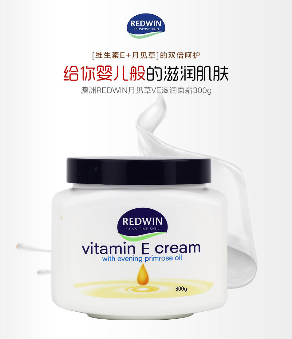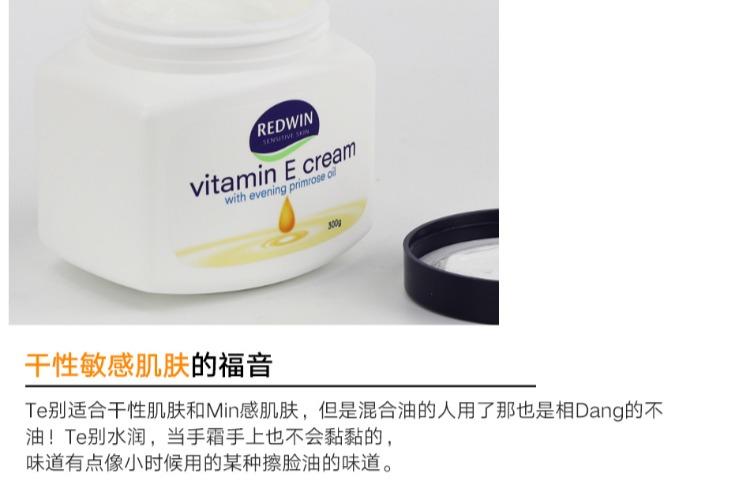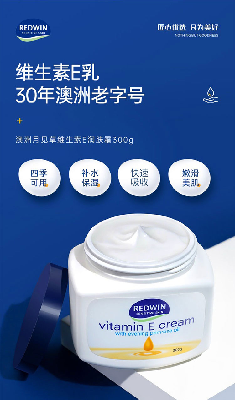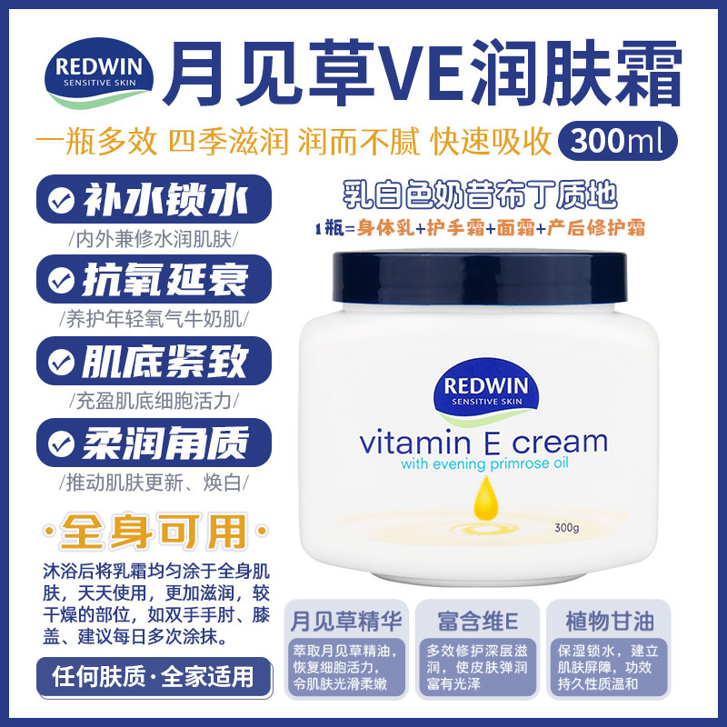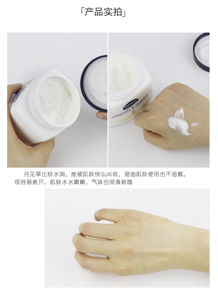可用於臉部與身體,非常溫和,敏感皮膚可用。維他命E潤膚霜,含月見草油。由澳洲皮膚科專家研究,結合兩大植物萃取保濕成份—甘油和山梨糖醇,配合促進健康和美麗功效的月見草油,獨有至高濃度植物成份,性質溫和,保濕鎖水功效至久,還可淡斑美白。