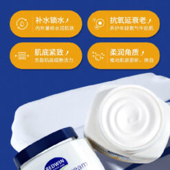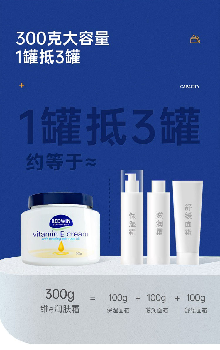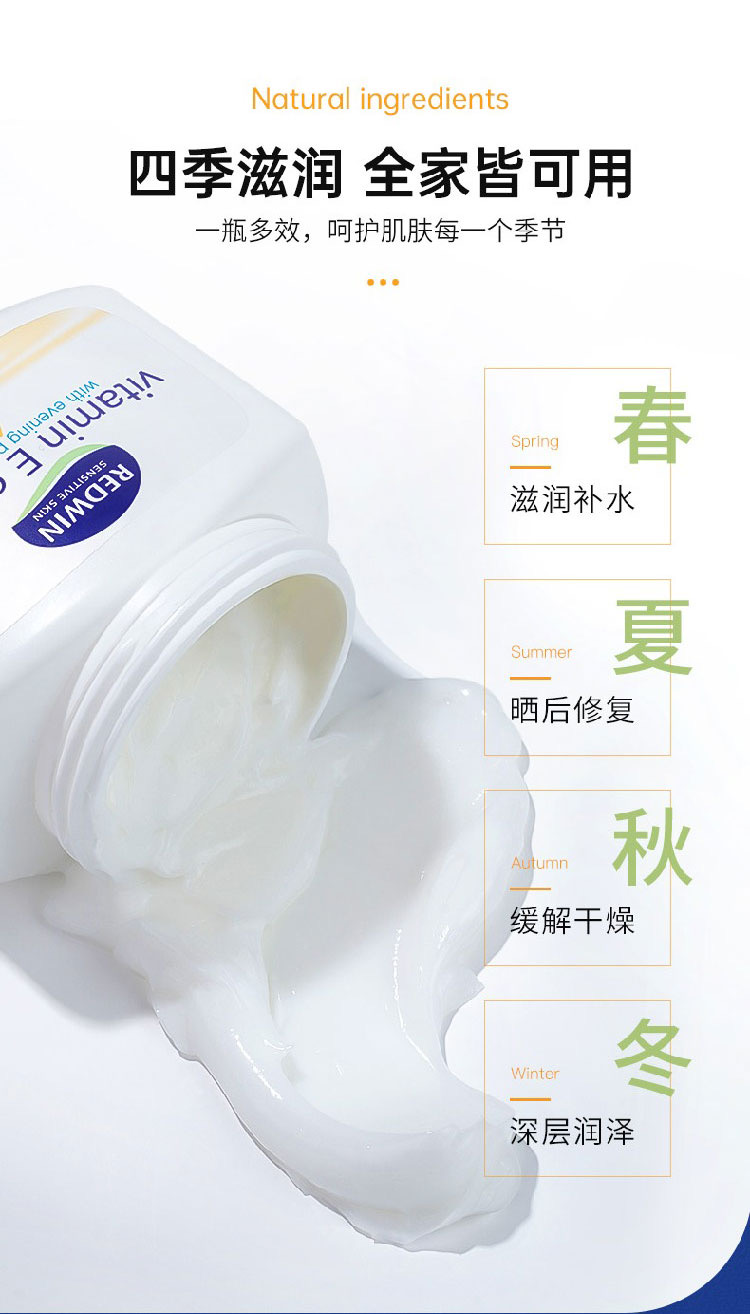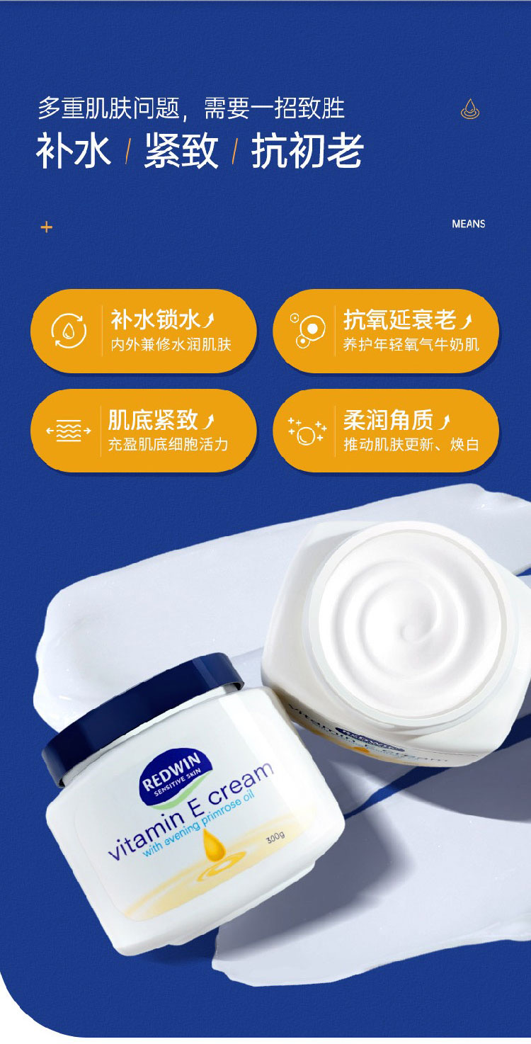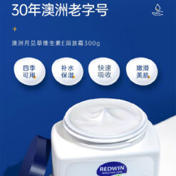 可用於臉部與身體,非常溫和,敏感皮膚可用。維他命E潤膚霜,含月見草油。由澳洲皮膚科專家研究,結合兩大植物萃取保濕成份—甘油和山梨糖醇,配合促進健康和美麗功效的月見草油,獨有至高濃度植物成份,性質溫和,保濕鎖水功效至久,還可淡斑美白。
