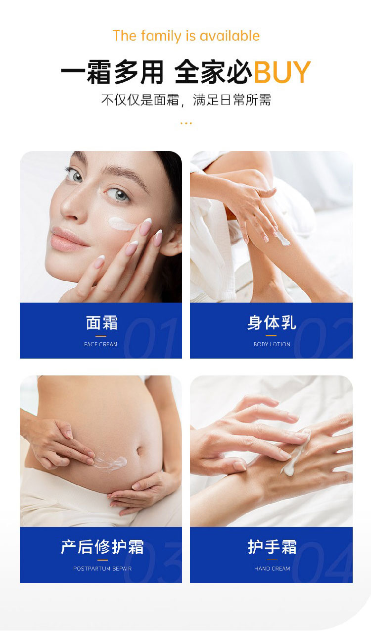 💫主要成分是維生素E、月見草油,都是保濕、抗氧化的成分✨,獨有高濃度植物成分 性質溫和 具有一定的抗氧化作用🍁,幫助軟化和光滑的皮膚乾燥減少瑕疵和增加皮膚彈性💫而且無添加無激素,孕婦和寶寶都可用,白色乳霜質地,很水潤,味道也是淡淡的,上身很好推開,而且一點也不厚重和油膩💦
