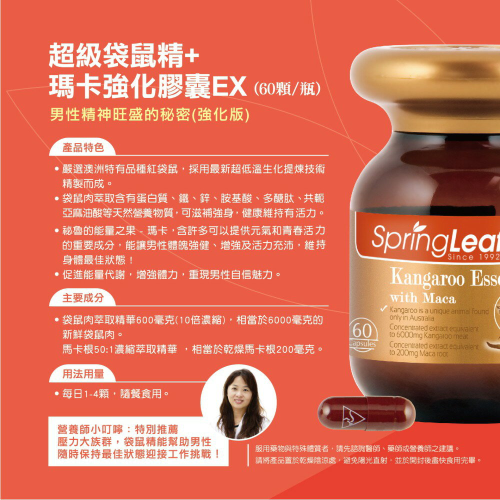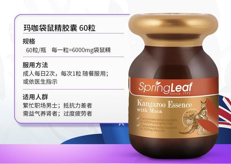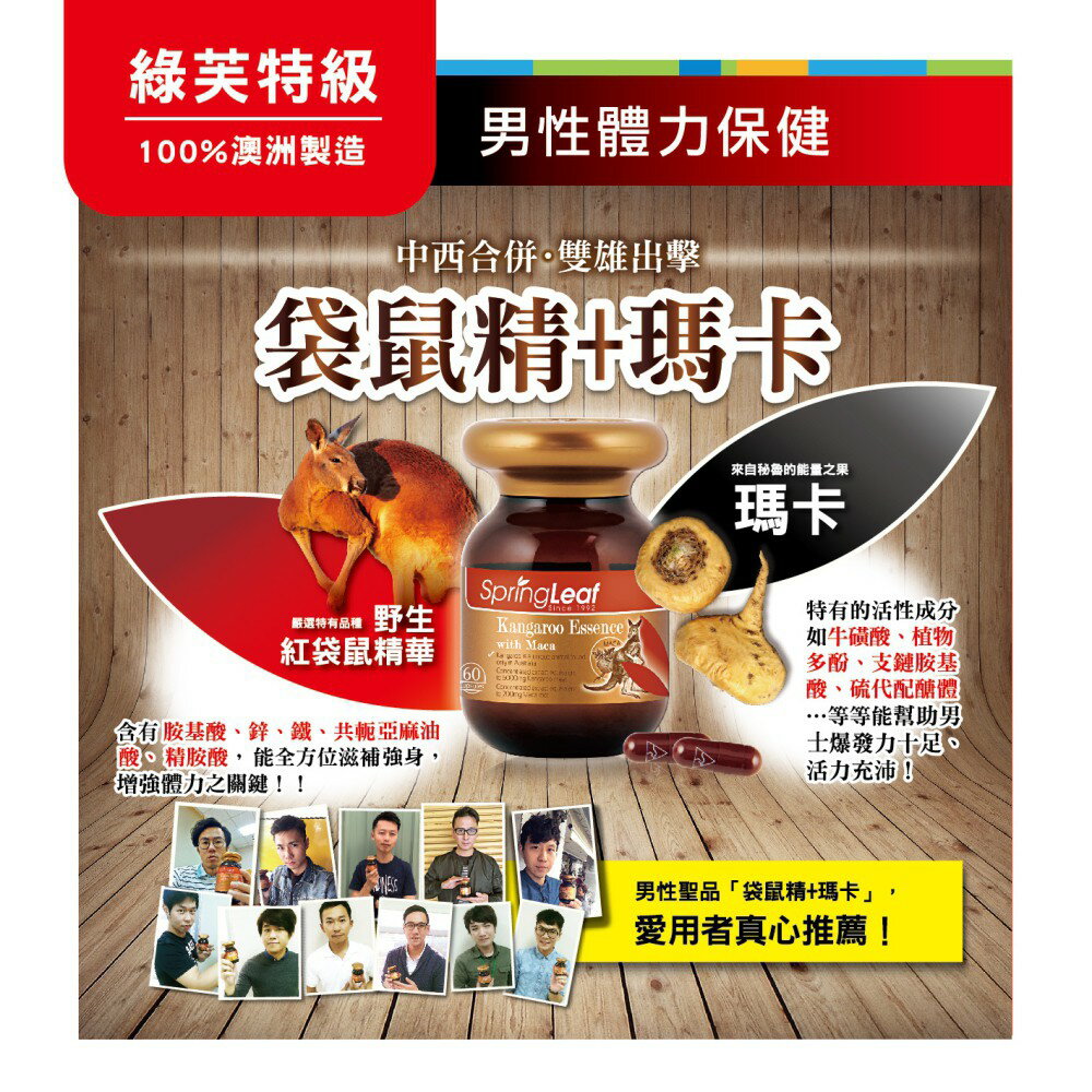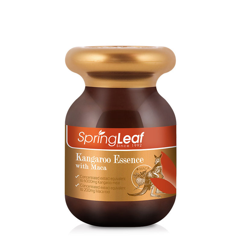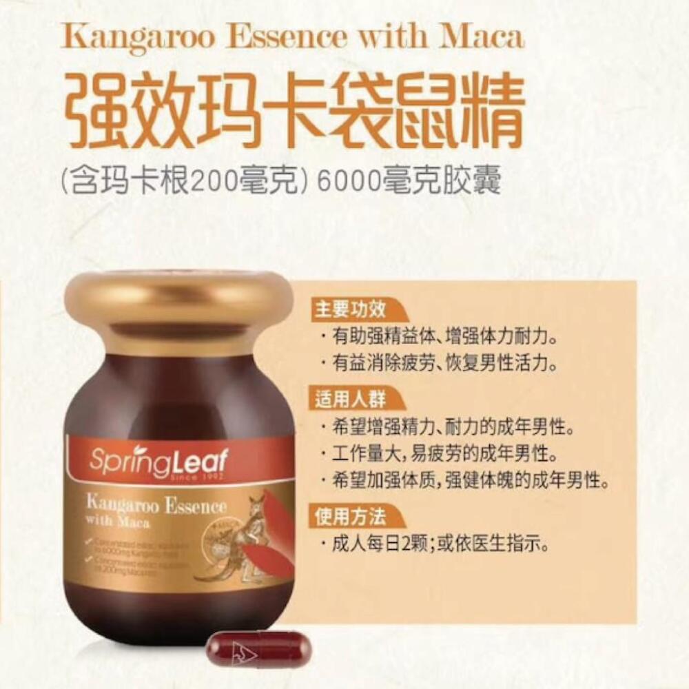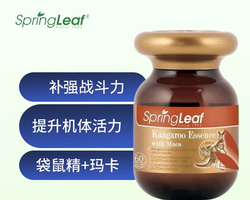 SpringLeaf® 綠芙袋鼠精華與瑪卡是款強效雙重配方, 有助支持男性能量和活力。袋鼠精華富含對男性有益的氨基酸、蛋白質、鋅、多糖、肽和其他天然礦物質。這些成分有助於滋補男性的能量和耐力。