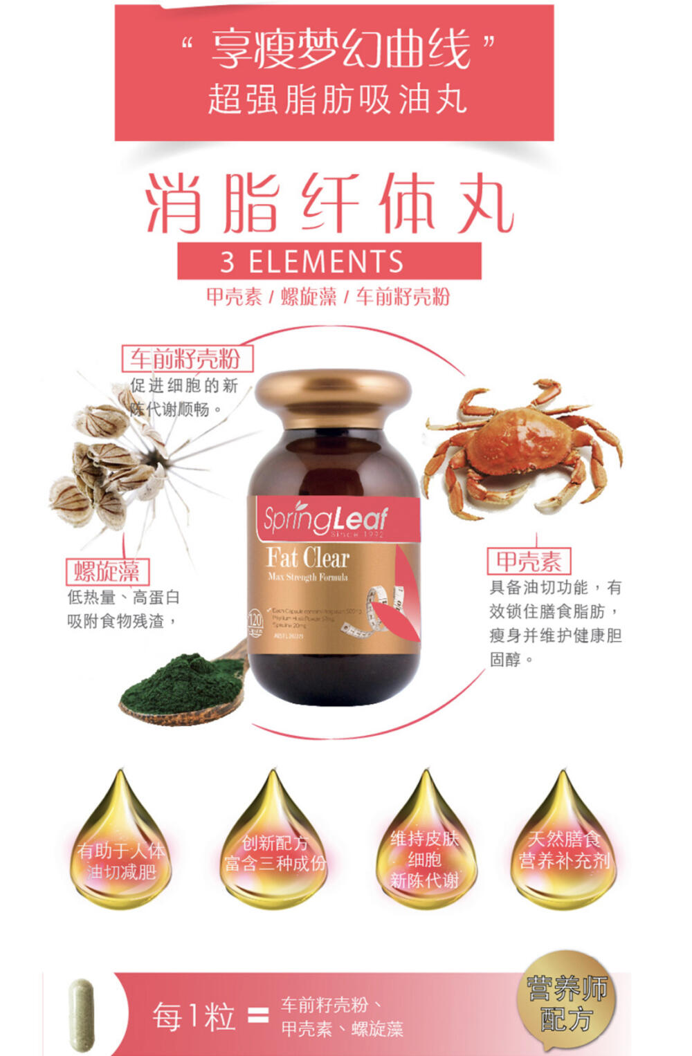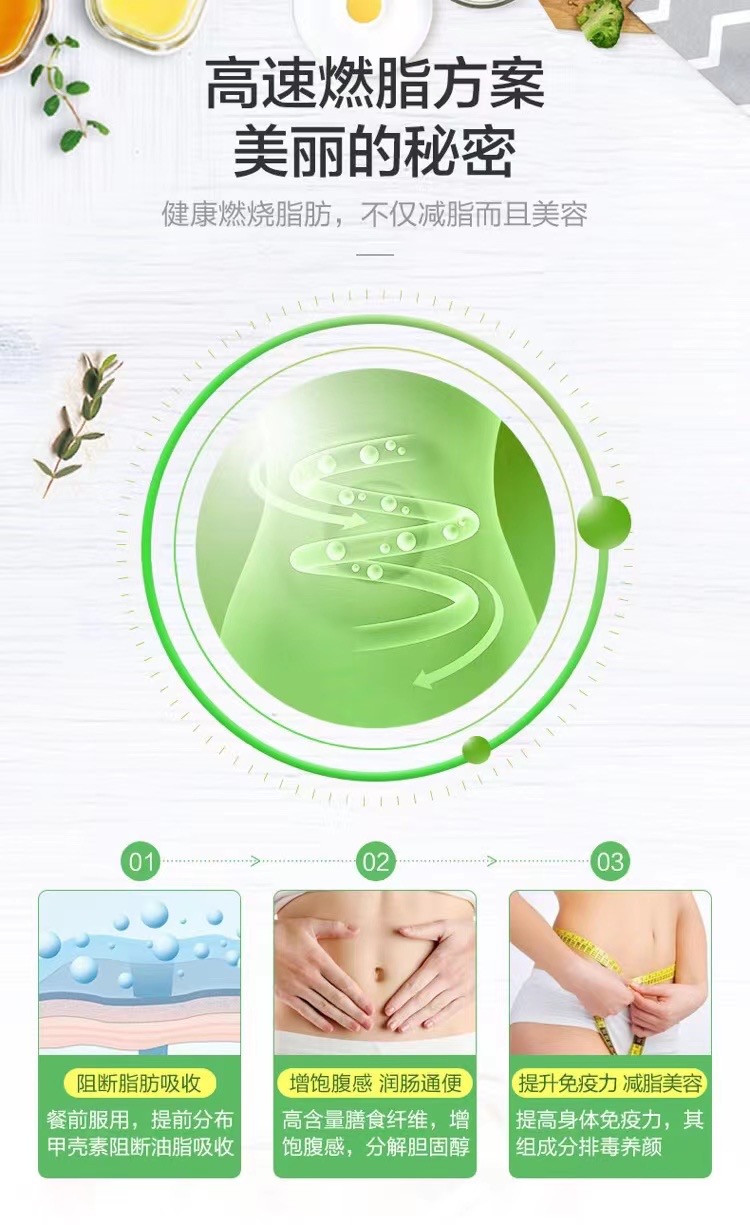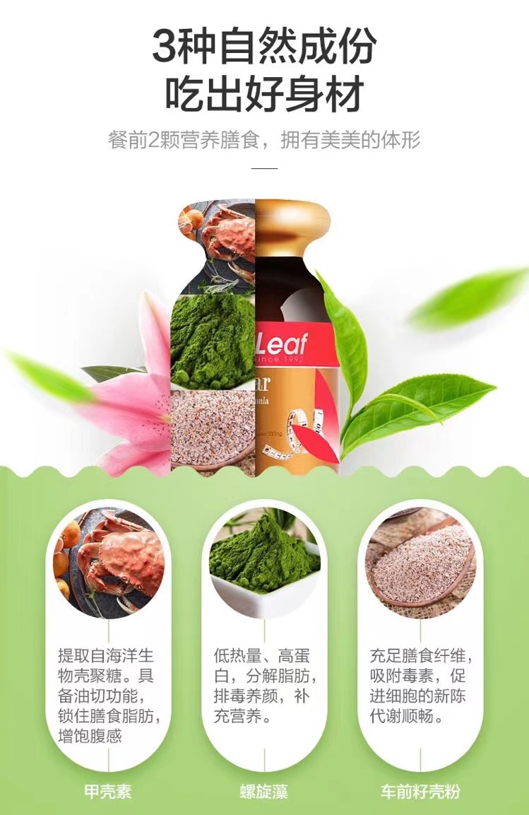 澳洲美女營養師強烈推薦!富含車前籽殼粉、螺旋藻及甲殼素,能有效切除油脂,鎖住膳食脂肪,吸附食物殘渣,同時補充營養、排毒養顏、祛脂減重、促進代謝。每次2粒,纖體輕盈,盡情享瘦!