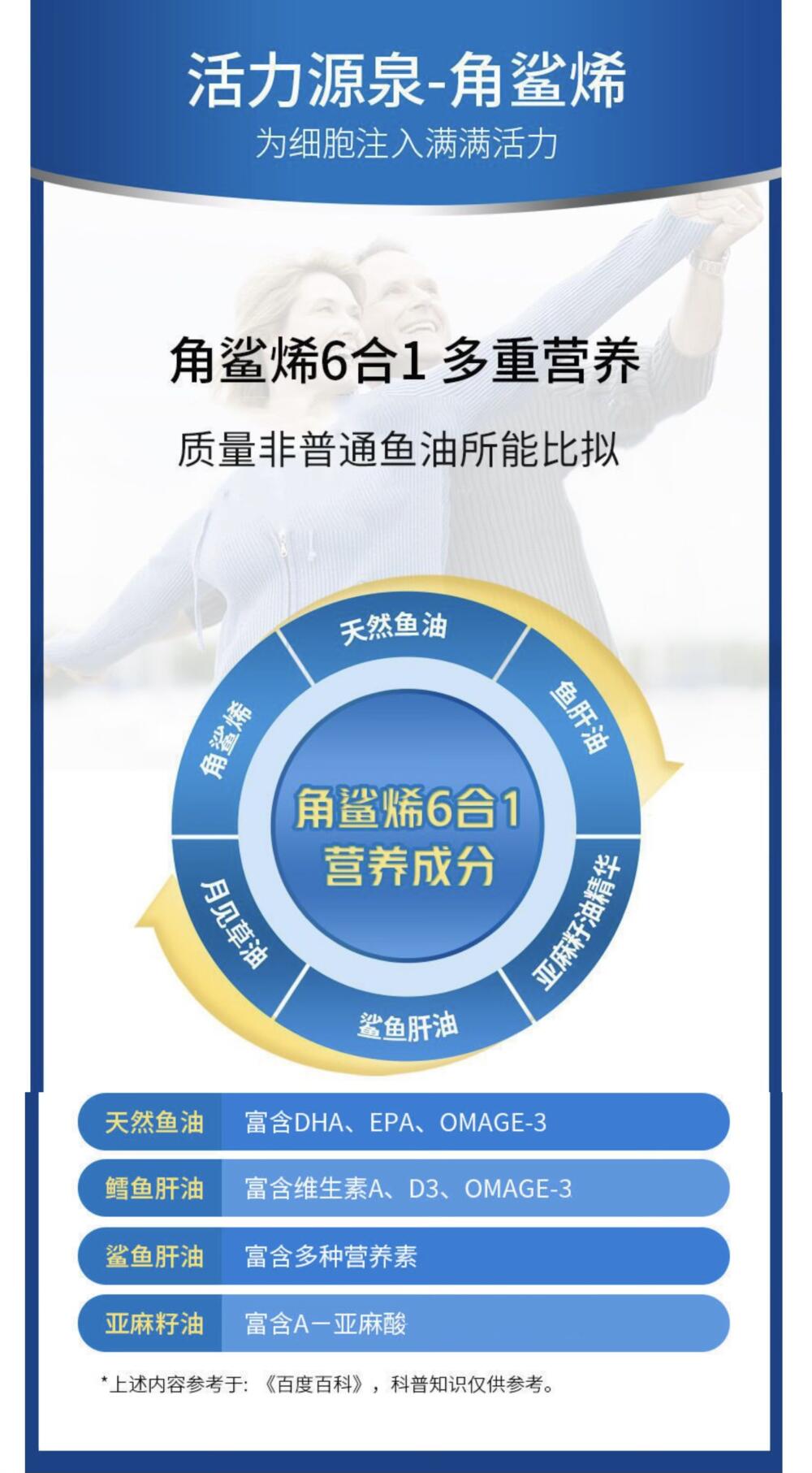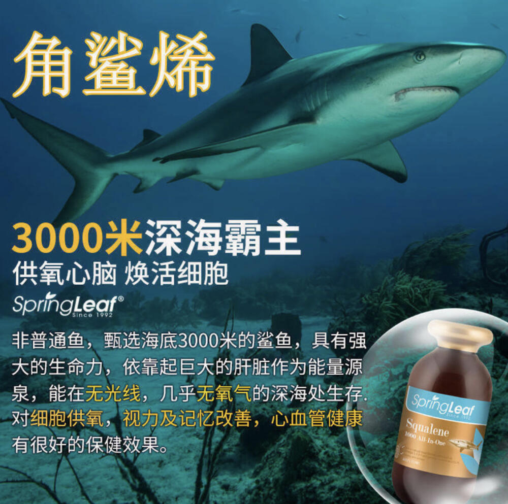 角鯊烯,防癌抗癌的佳品,它取自鯊魚肝臟,有助於平衡三高,高血壓、高膽固醇、高血脂,對於煙酒過多,失眠,加班熬夜的,酸性體制,支氣管炎,過敏體制的人也有顯著調理作用。