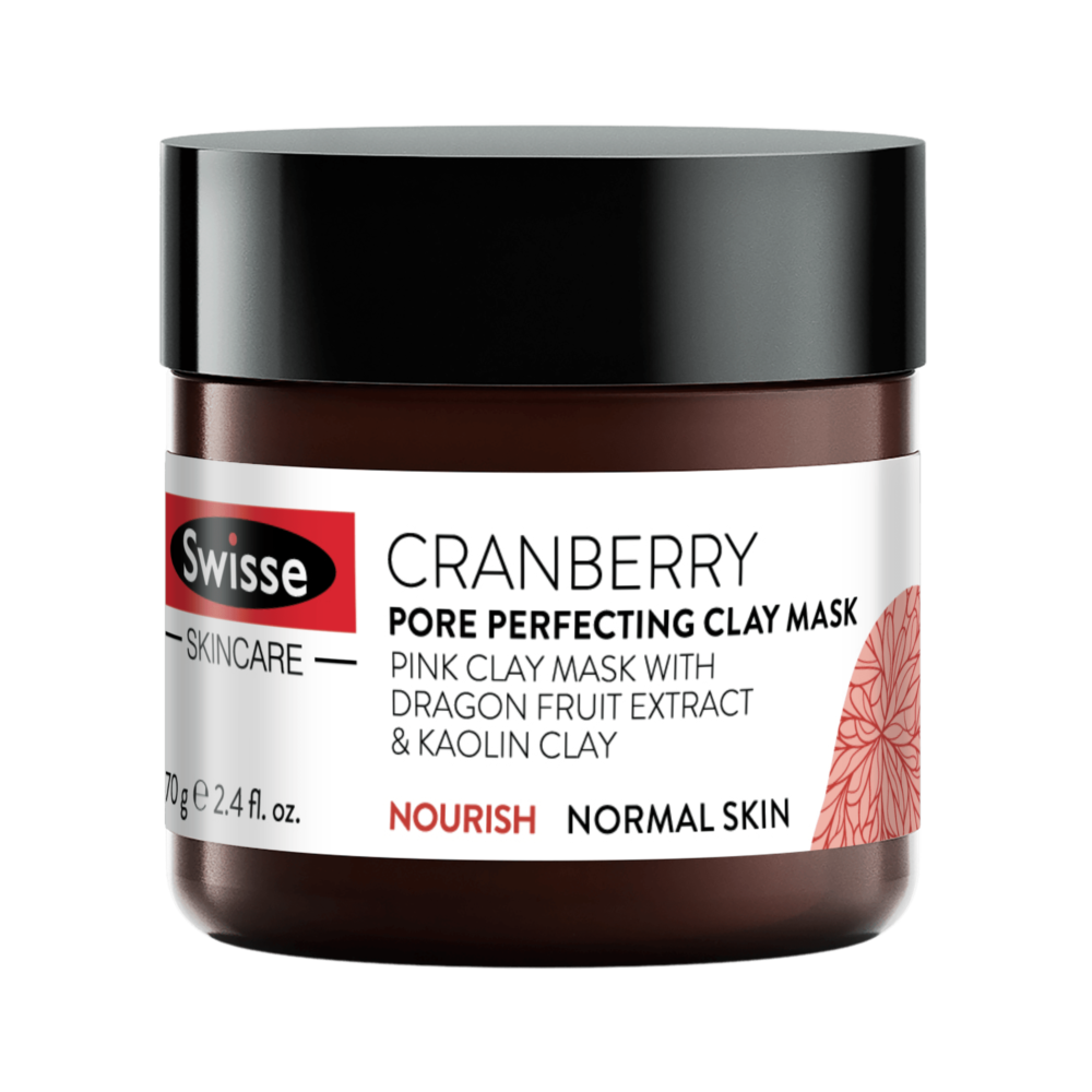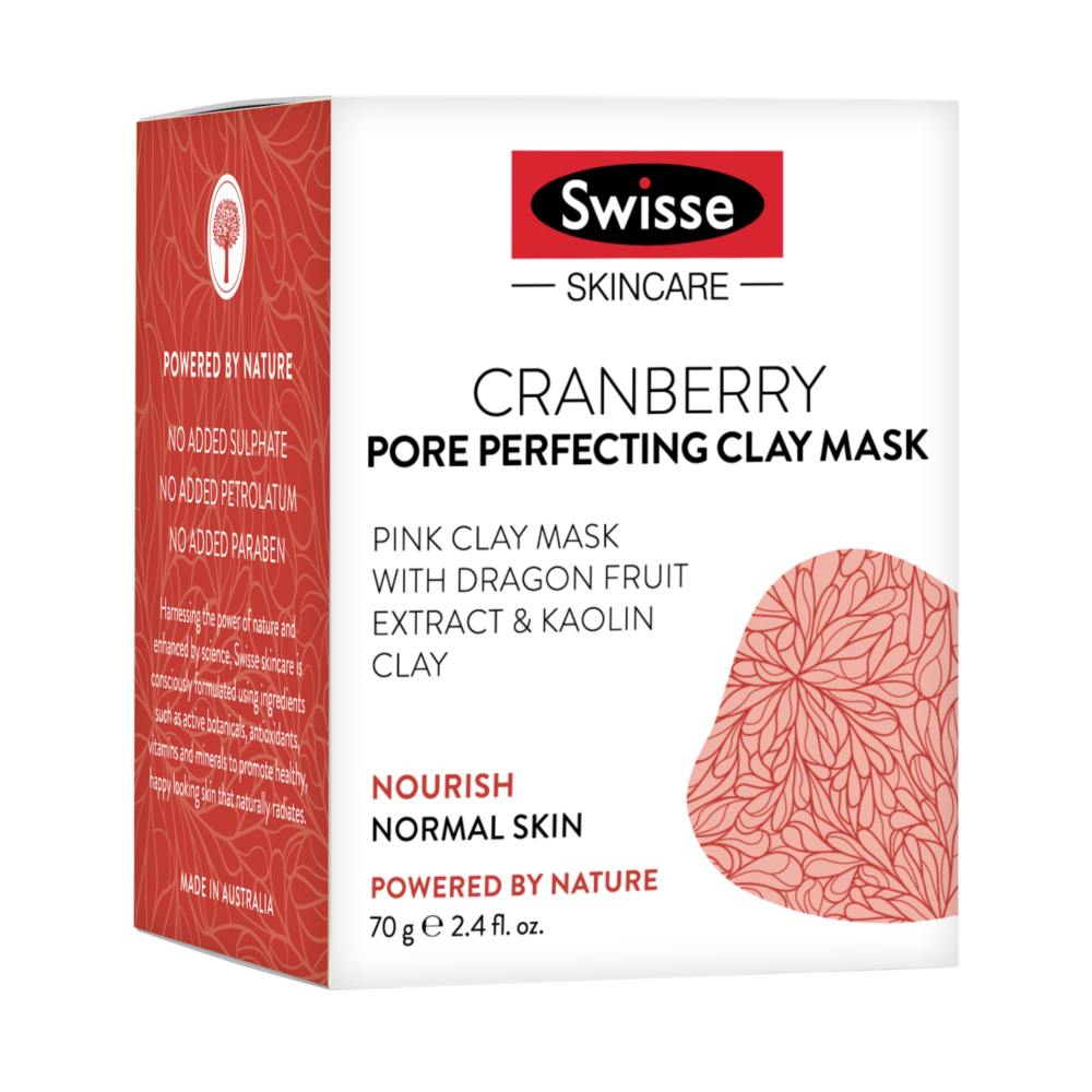 Swisse蔓越莓毛孔緊緻泥面膜蘊含高嶺土,深層潔淨肌膚,同時去除多餘死皮及收細毛孔,打造升級護膚效果,肌膚看起來細滑清新。