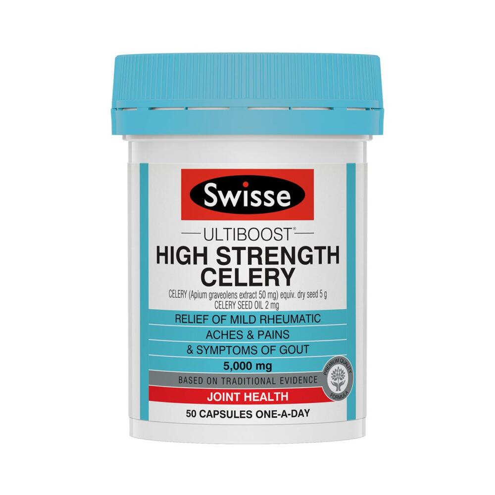 Swisse Ultiboost 高強度芹菜是一種優質配方,含有芹菜籽,可幫助緩解輕度風濕性疼痛和痛風症狀。