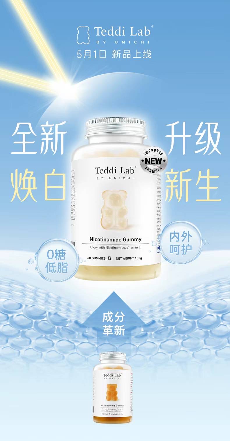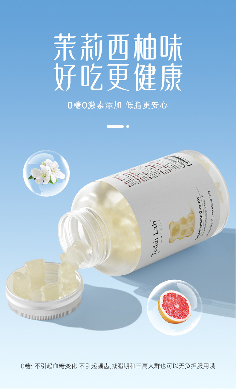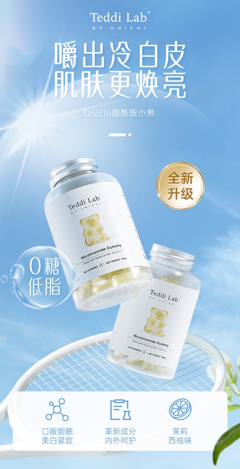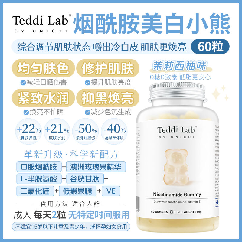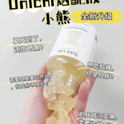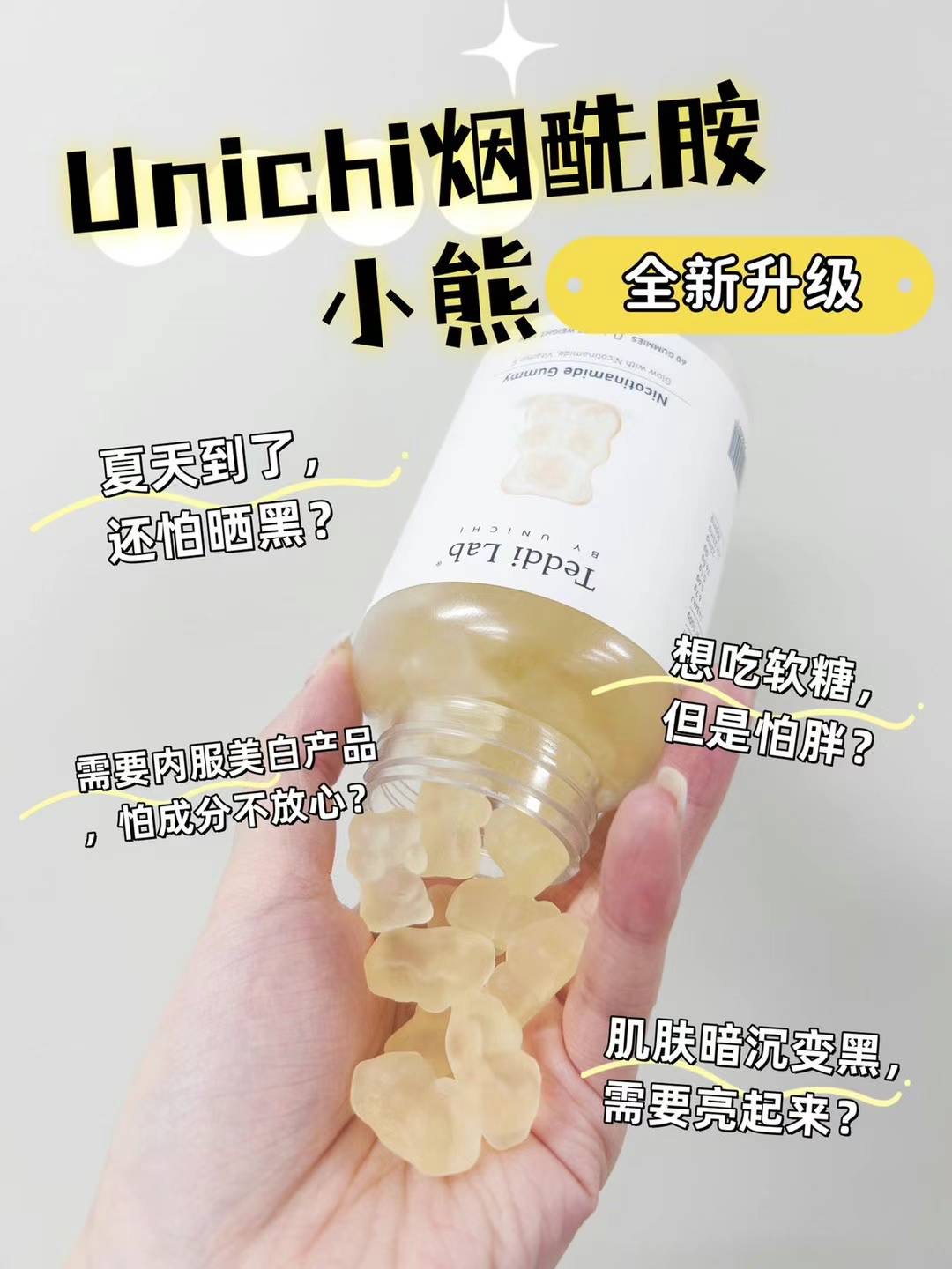 🌈全新升級版Unichi煙酰胺美白小熊軟糖來幫你!加上升級的L-半胱氨酸,谷胱甘肽,讓你的皮膚發光,更好的提升肌膚質感及亮度💡🌟清爽的茉莉西柚口感,搭配著富含的煙酰胺和玫瑰果精華,抑制住臉上的黑色素暗沉,成分0糖0激素,吃著放心!