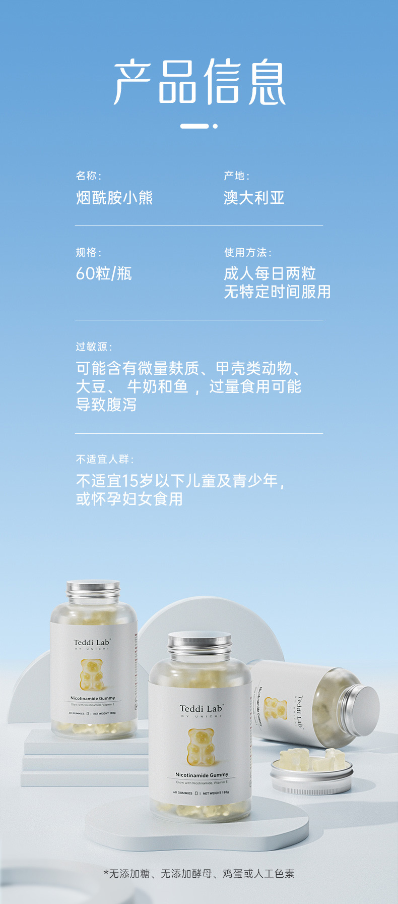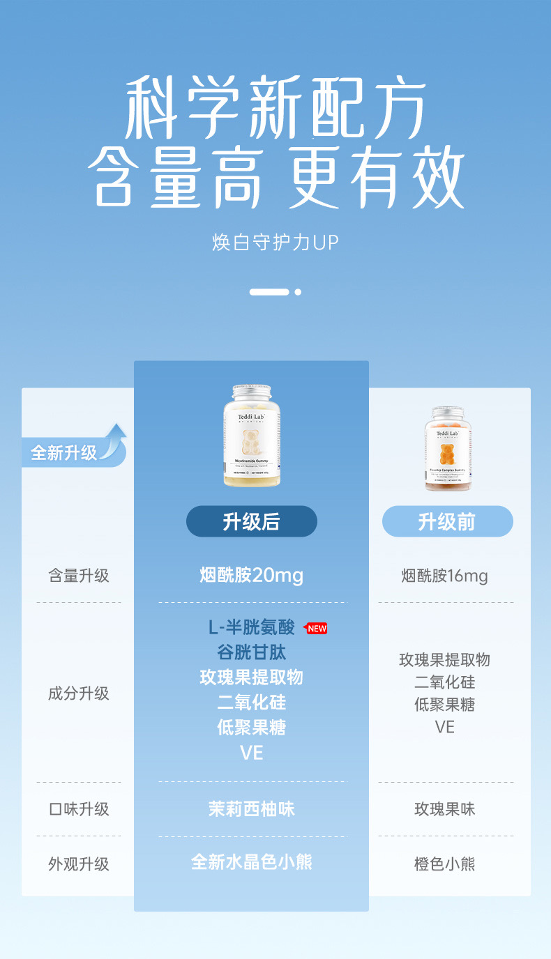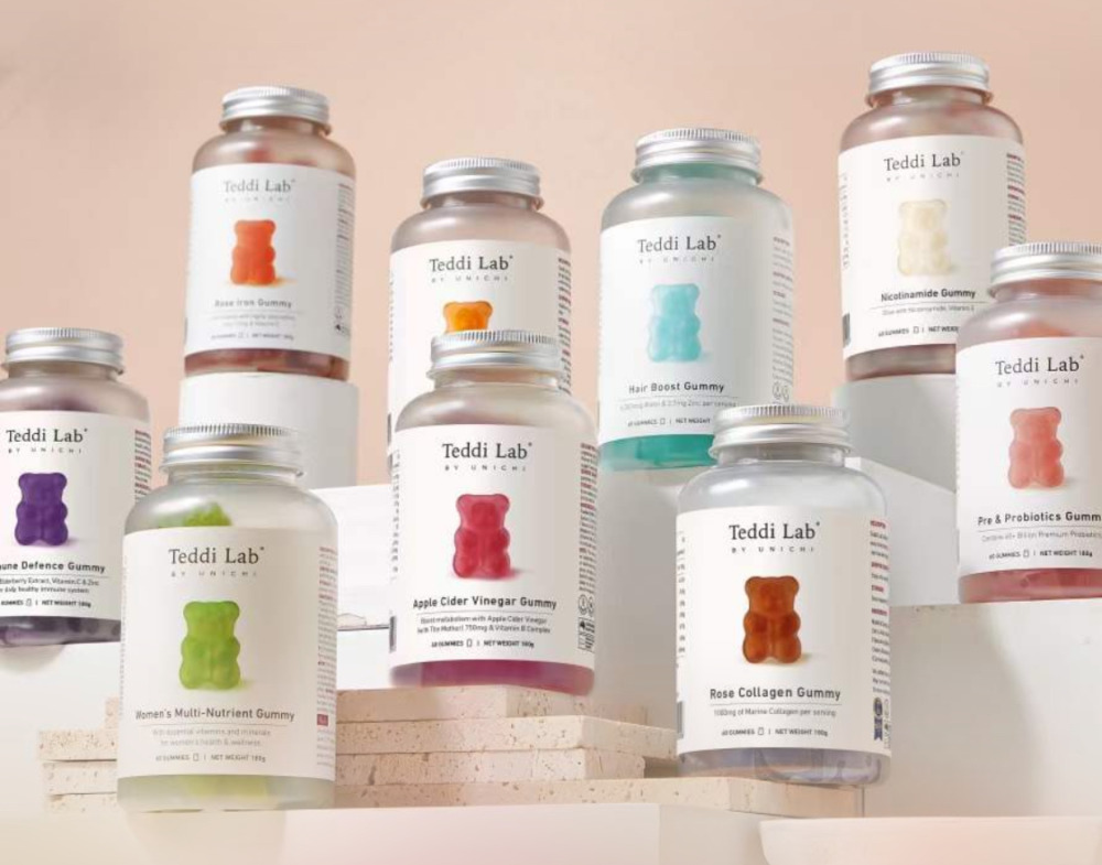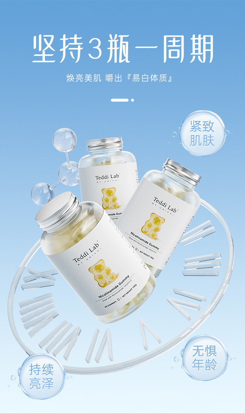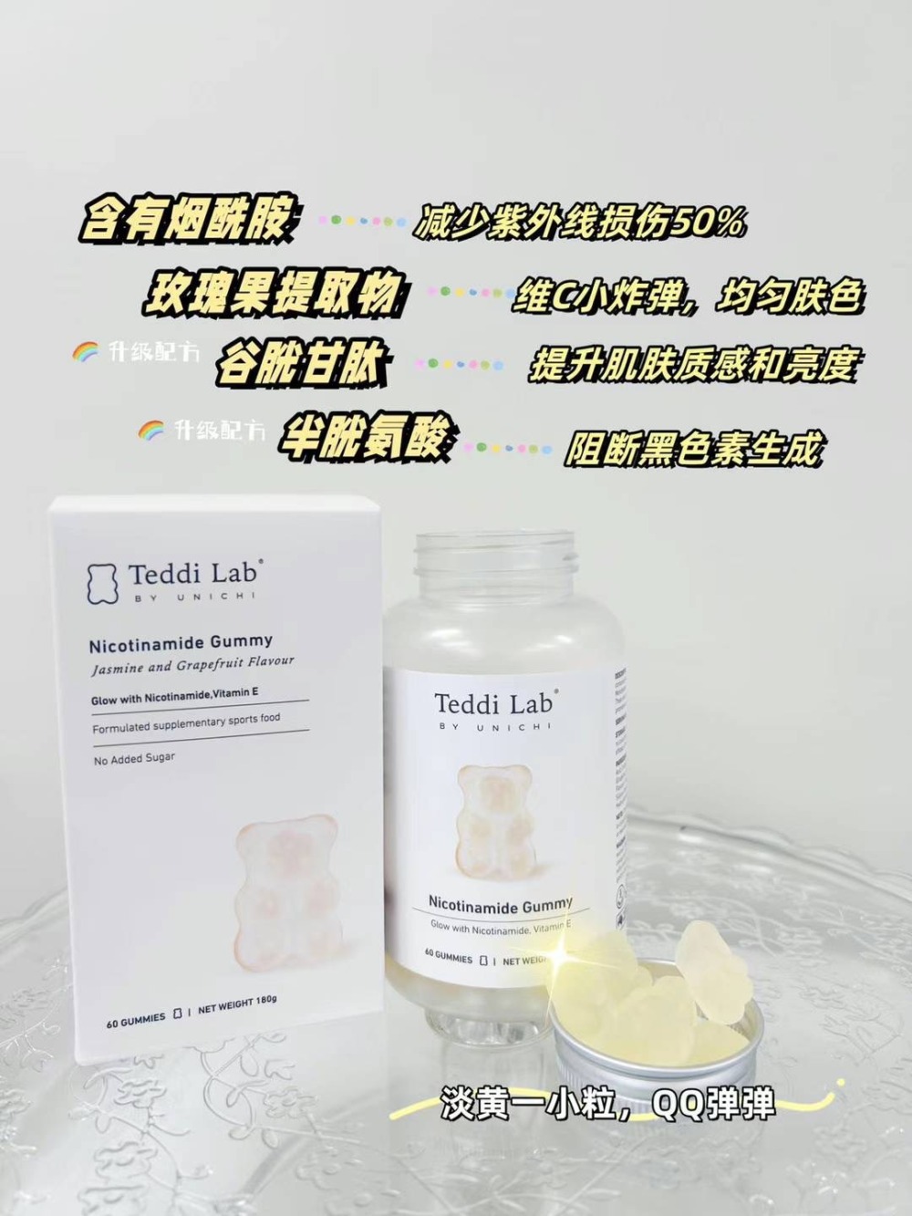 🌈全新升級版Unichi煙酰胺美白小熊軟糖來幫你!加上升級的L-半胱氨酸,谷胱甘肽,讓你的皮膚發光,更好的提升肌膚質感及亮度💡🌟清爽的茉莉西柚口感,搭配著富含的煙酰胺和玫瑰果精華,抑制住臉上的黑色素暗沉,成分0糖0激素,吃著放心!