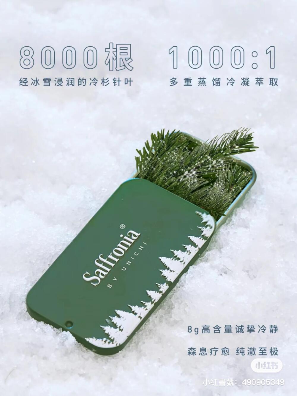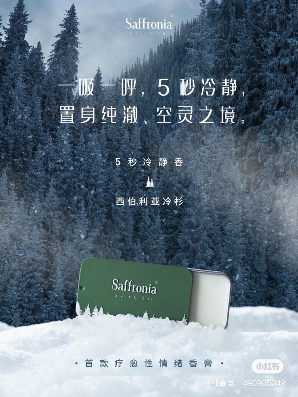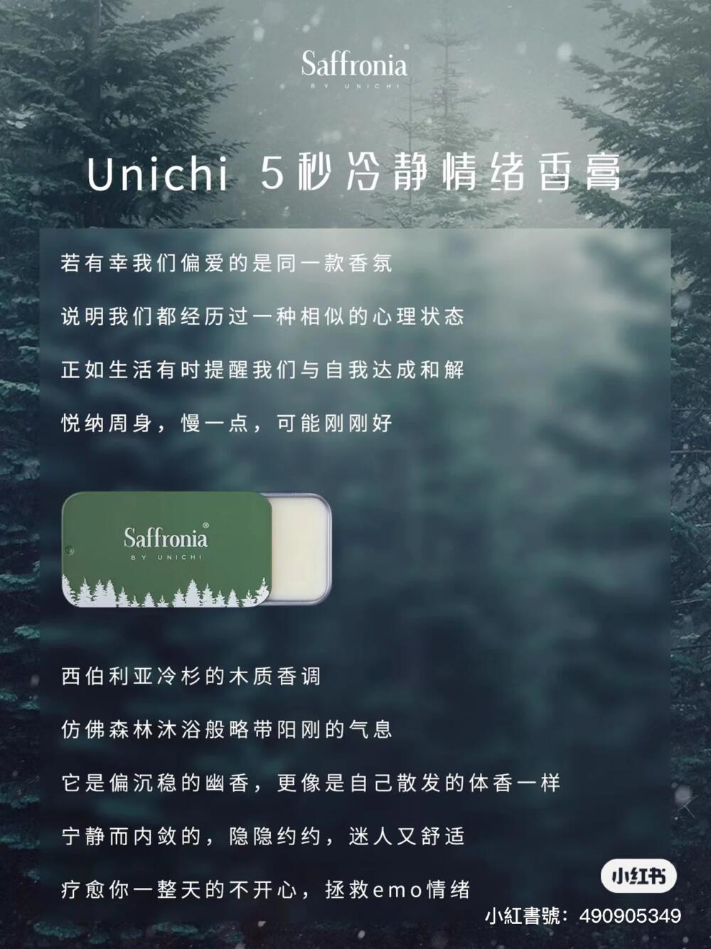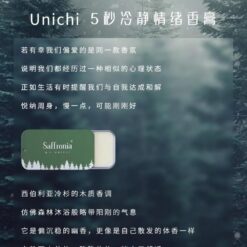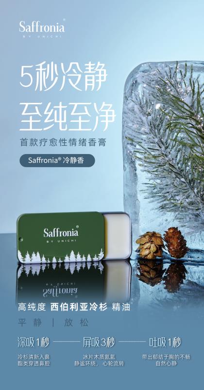 Unichi Saffronia 冷靜香,萃取西伯利亞冷杉精油,西伯利亞冷杉樹被稱為植物界「活化石」,始於 2.5 億年前,歷經 2 個冰川紀。