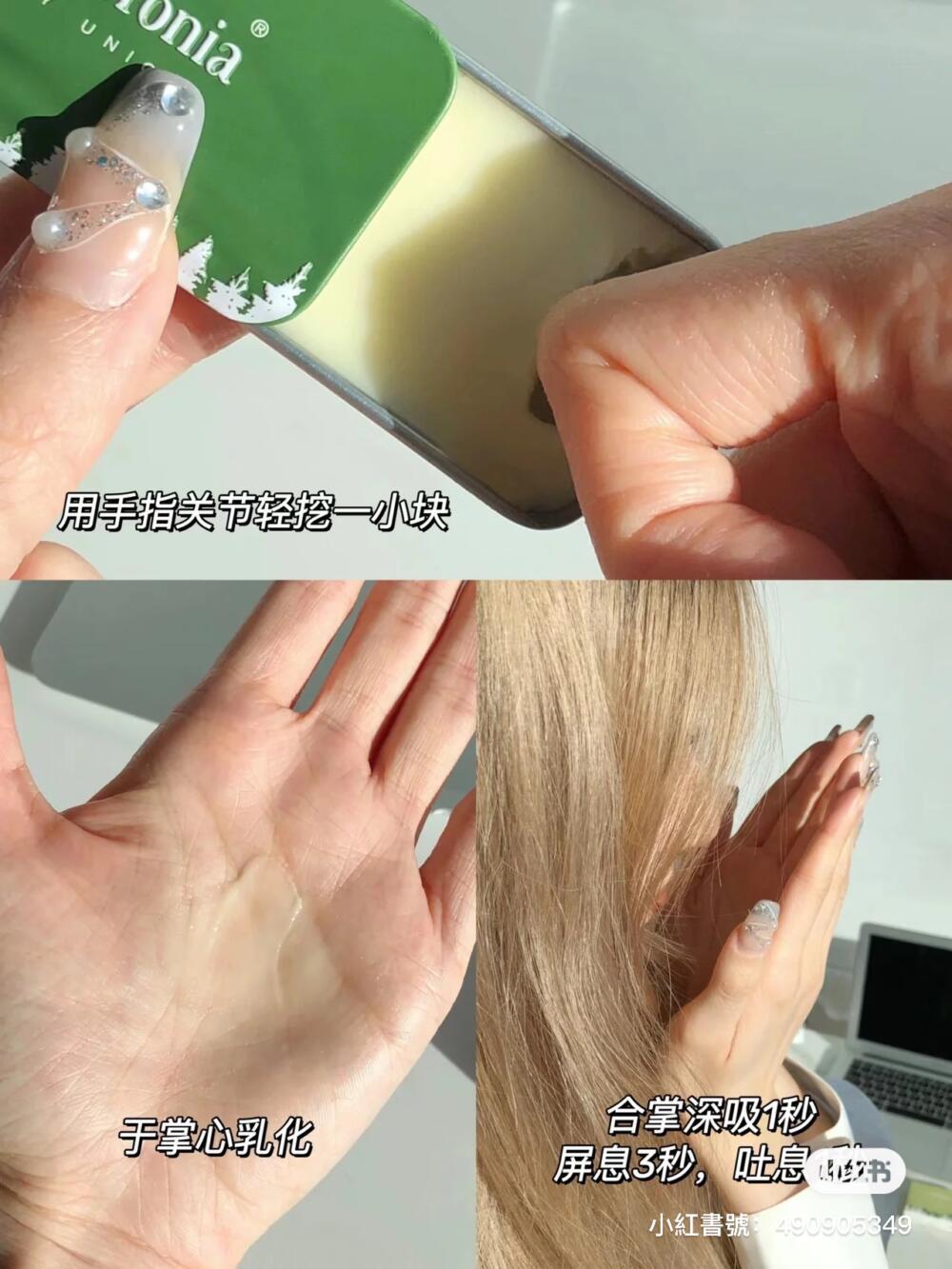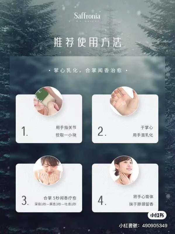推薦使用方法:掌心乳化,合掌聞香療癒:用手指關節挖取一小塊,於掌心用手溫乳化,合掌聞香,深吸 1 秒,屏息 3 秒,吐息 1 秒。特別適合在瑜伽、冥想或重要活動前使用,平復心緒。